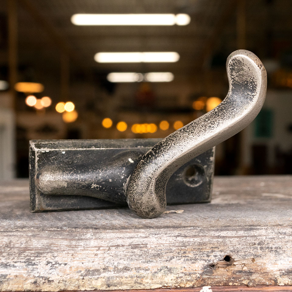 Architectural salvage antique brass casement window latch hardware with catch measuring approximately 1" x 2 3/4" (mounting area) and 3 1/8" x 3/4" (overall). The latch measures 7/8" x 3". 10 right-hand and 4 left-hand latches available. Color and condition vary, see photos to evaluate. Priced at $15/ each.
