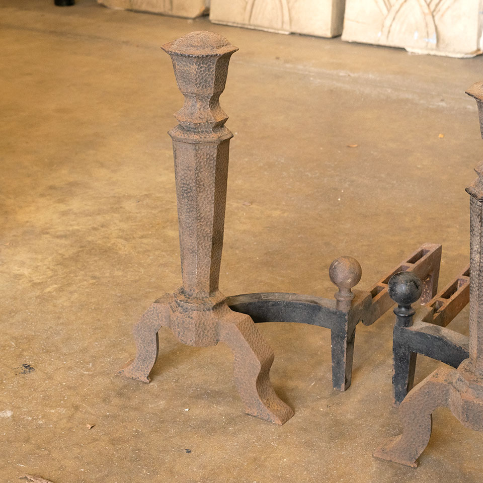 Pair of vintage antique architectural salvage Arts & Crafts fireplace andirons with hammered finish each measuring approximately 11" wide x 18 1/4" tall x 17" front to back. Marked ADAMS on the bottom. Priced at $250 for the pair.