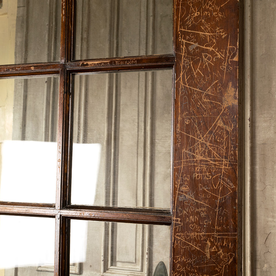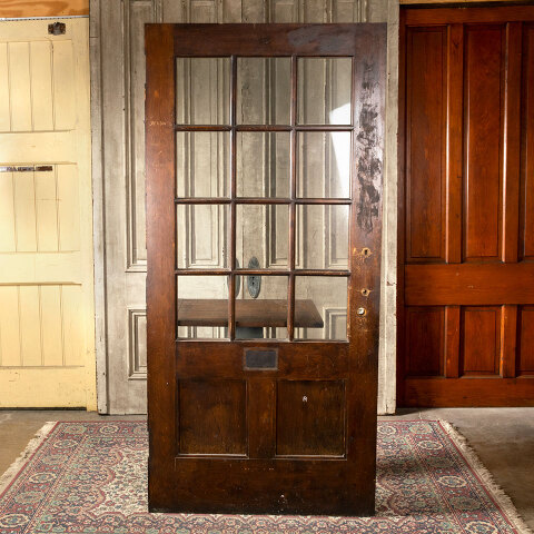 Antique architectural salvage paneled wood and glass classroom door with divided twelve lite window measuring approximately 39" wide x 81 7/8" tall x 1 3/4" thick. This door was reclaimed from Grandview Heights High School in Columbus, Ohio prior to interior renovations. See photos to evaluate condition.
