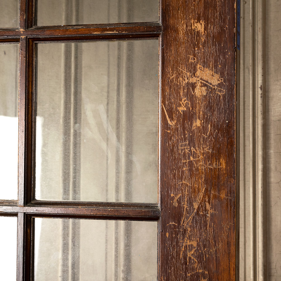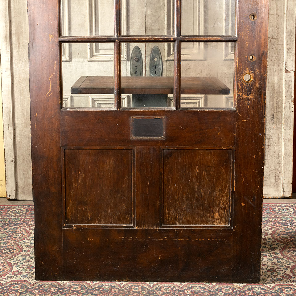 Antique architectural salvage paneled wood and glass classroom door with divided twelve lite window measuring approximately 39" wide x 81 1/2" tall x 1 3/4" thick. This door was reclaimed from Grandview Heights High School in Columbus, Ohio prior to interior renovations. See photos to evaluate condition.
