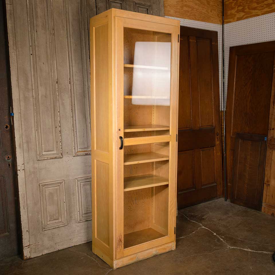 Architectural salvage vintage maple science laboratory classroom cabinet with glass door and adjustable shelves measuring approx. 27" wide x 83 3/4" tall x 16" front to back. This cabinet was salvaged from Grandview Heights High School in Grandview, Ohio prior to the renovation of the building. See photos to evaluate condition.