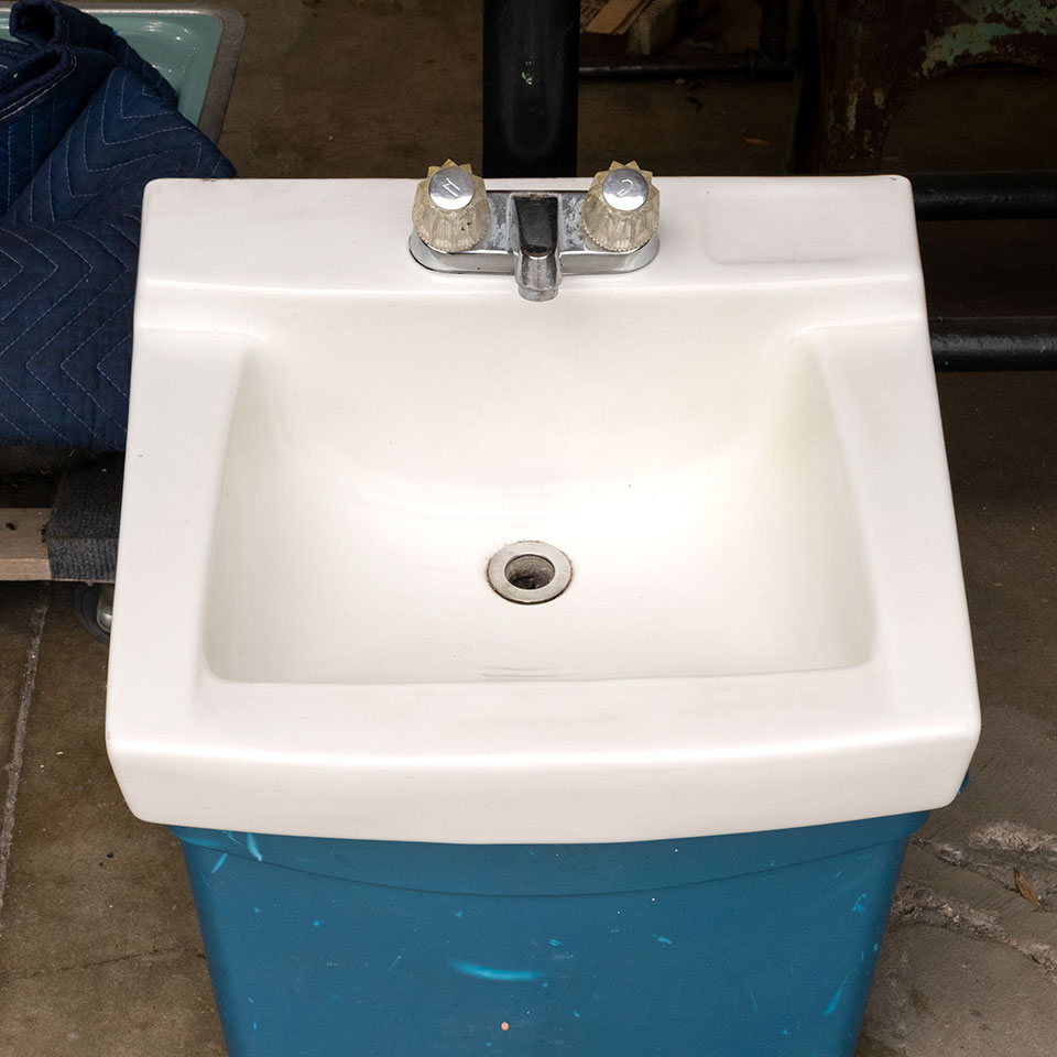 Vintage American Standard porcelain wall mount bathroom sink measuring approximately 19 1/4" wide x 9 1/2" tall x 17" front to back. Mounting bracket included. The plumbing fixtures have not been tested.