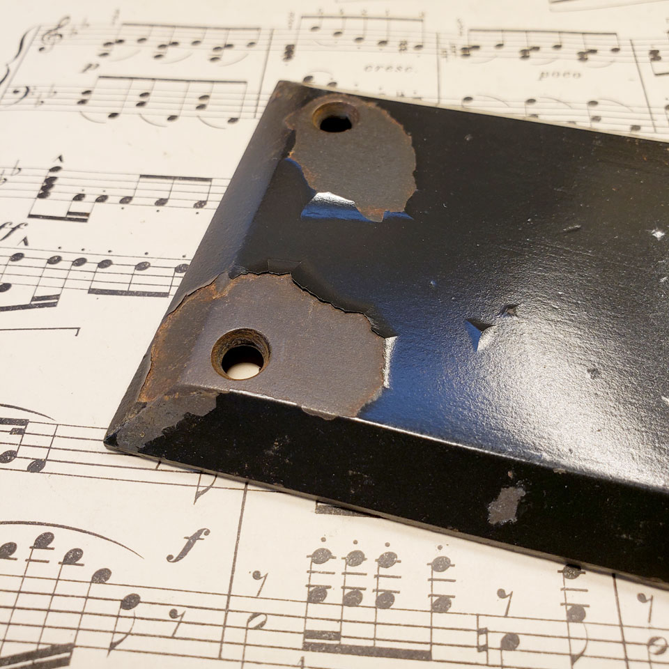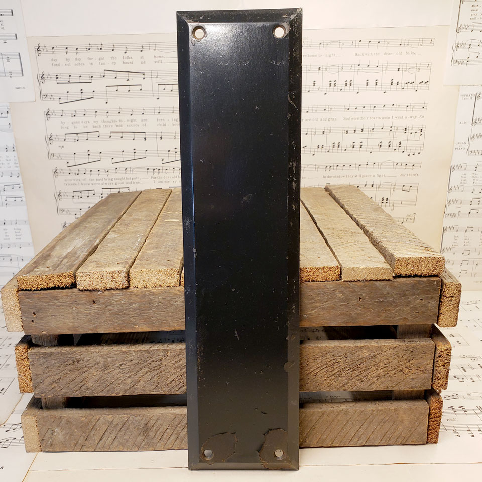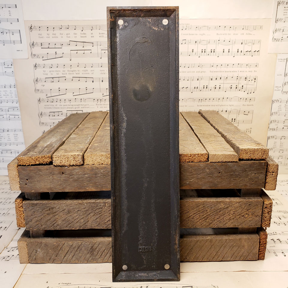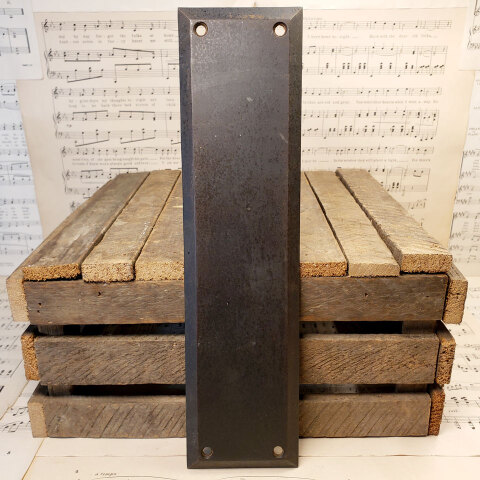 Architectural salvage antique heavy cast iron push plate door hardware measuring approx. 3" wide x 11 7/8" tall with a 1/4" beveled edge. This hardware was reclaimed from Grandview Heights (Ohio) High School prior to interior renovations. Color and condition may vary.