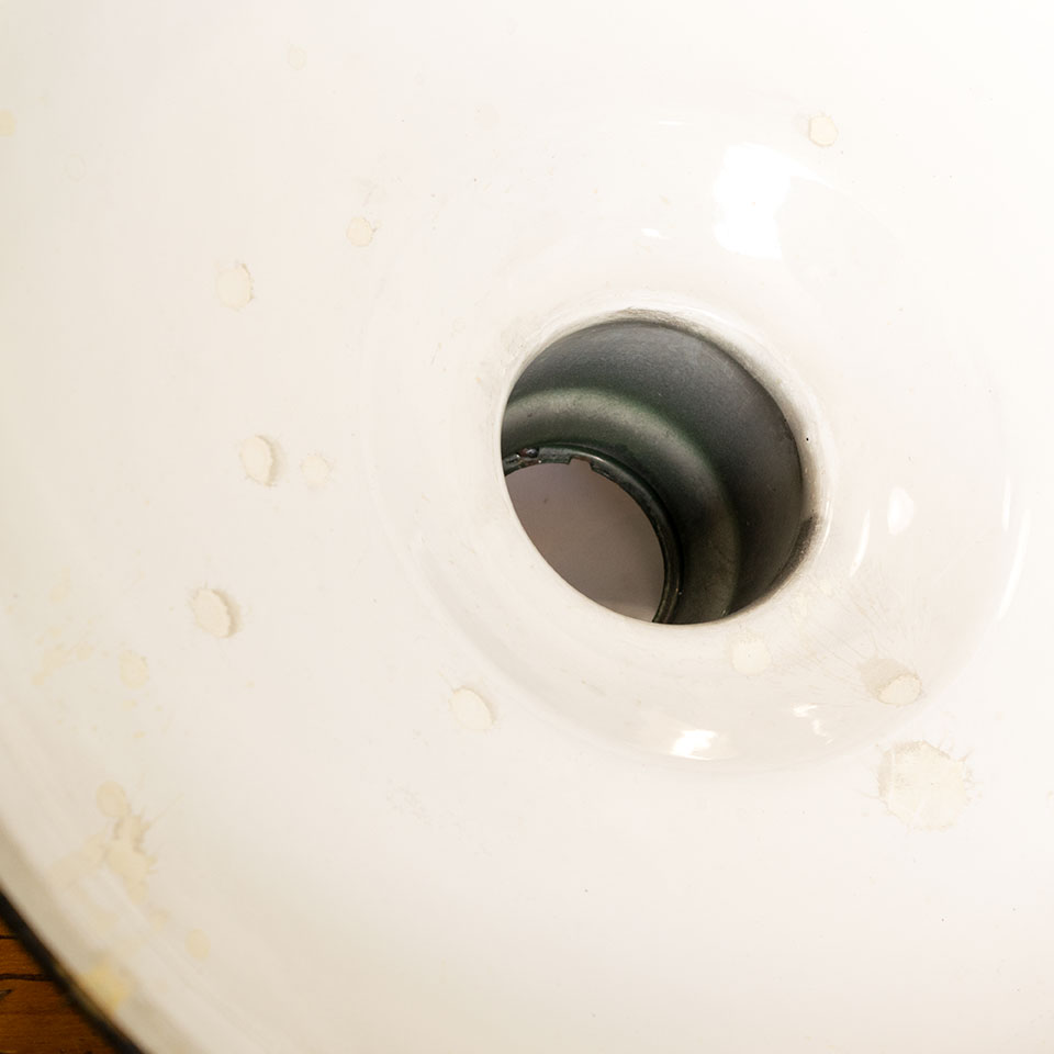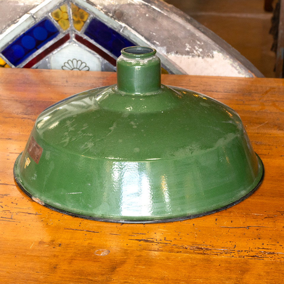 Architectural salvage antique Westinghouse Reflector green porcelain enameled industrial light shade measuring approx. 16" in diameter x 7 3/4" tall. The socket fitter opening measures approx. 1 3/4" in diameter. See photos to evaluate condition.