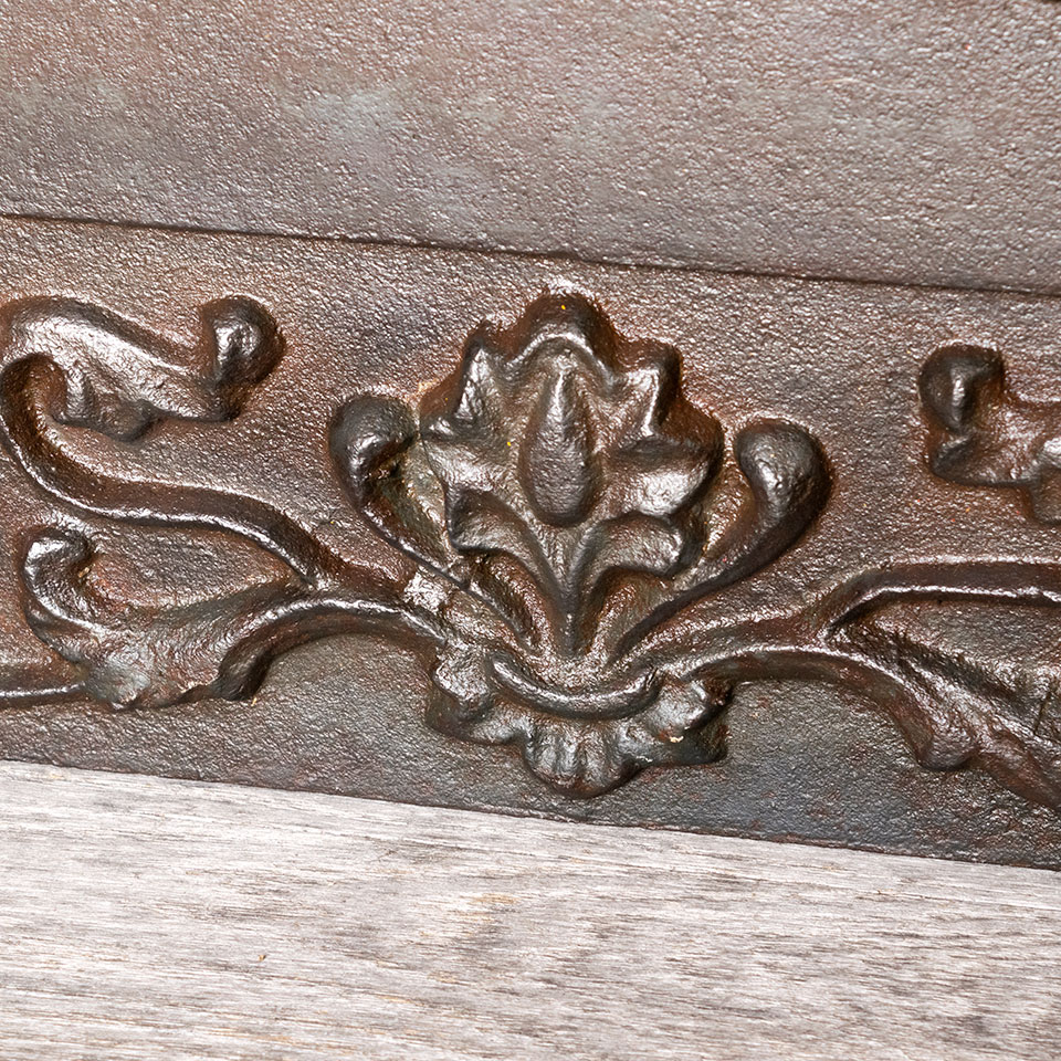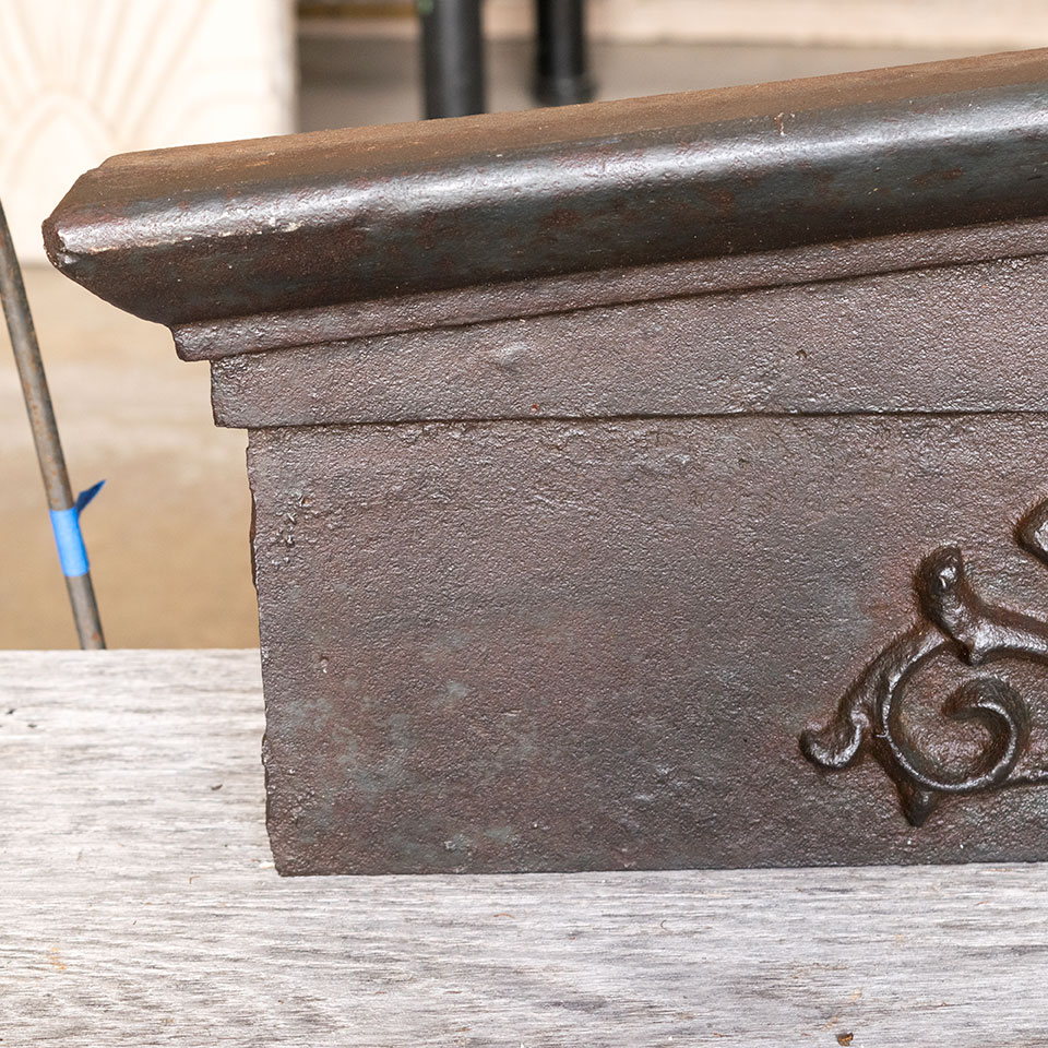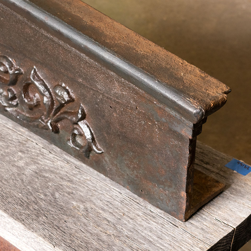 Vintage antique architectural salvage cast iron building pediment window header measuring approximately 40 3/8" wide x 10 1/2" tall x 4 3/4" front to back. Sold individually. Priced at $450/each. Condition may vary.