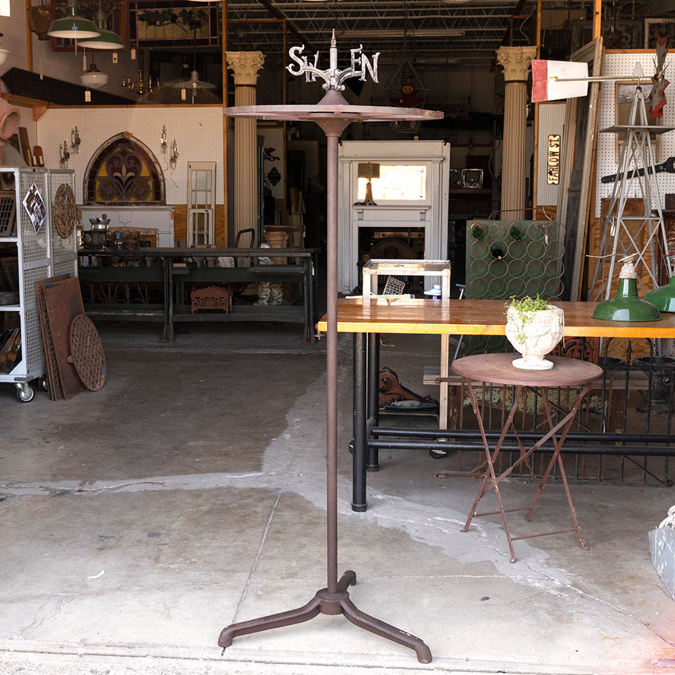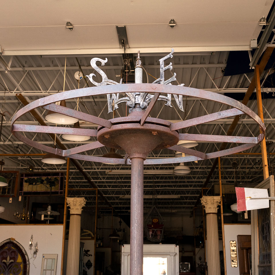 Vintage antique rusty metal circular clothes rack with weathervane directional topper measuring approximately 27 1/2" in diameter x 77" tall with a 32" diameter base.
