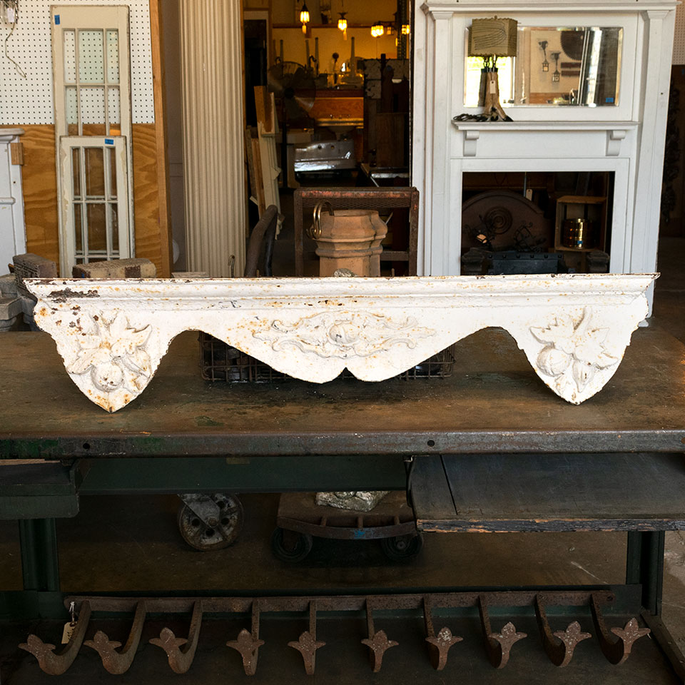 Vintage antique architectural salvage cast iron building lintel sill measuring approximately 41" long x 8 1/2" tall x 7 1/4" front to back.