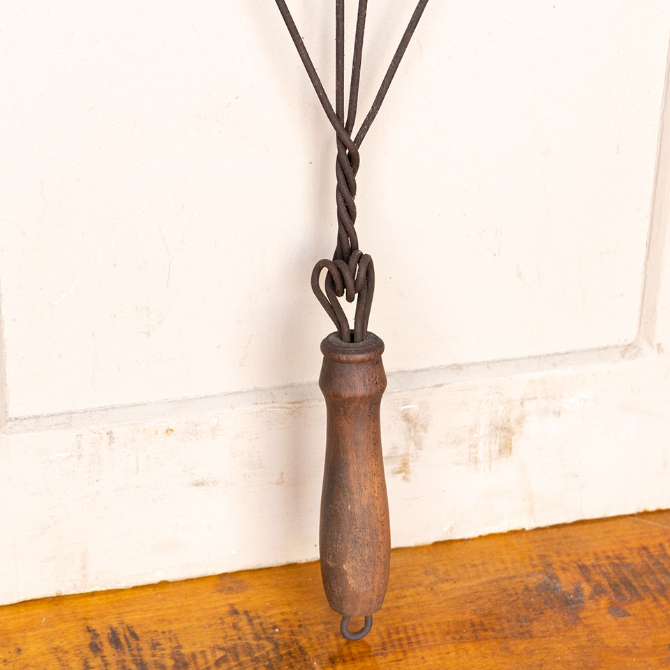 Antique primitive hand made wood and metal wire rug beater tool measuring approximately 9" wide x 31 1/2" tall.