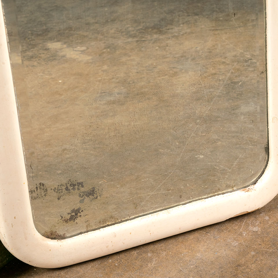 Antique wall hanging wood frame with rounded corners and beveled glass mirror measuring approximately 19 1/2" wide x 23 1/2" tall x 1" thick.