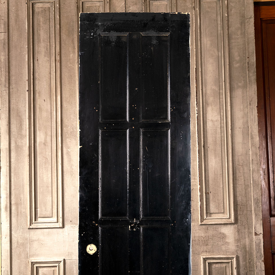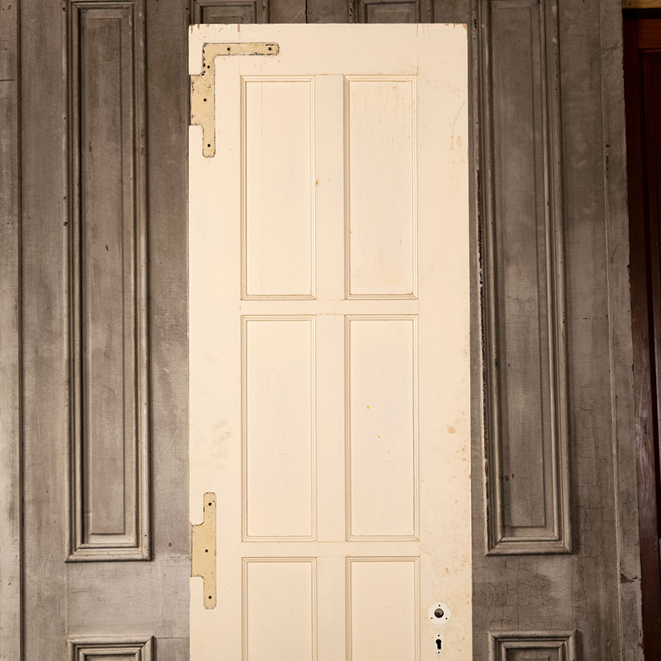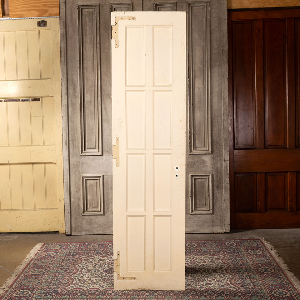 Antique architectural salvage eight panel interior painted wood door measuring approximately 21 7/8" wide x 83 13/16" tall x 1 3/8" thick.
