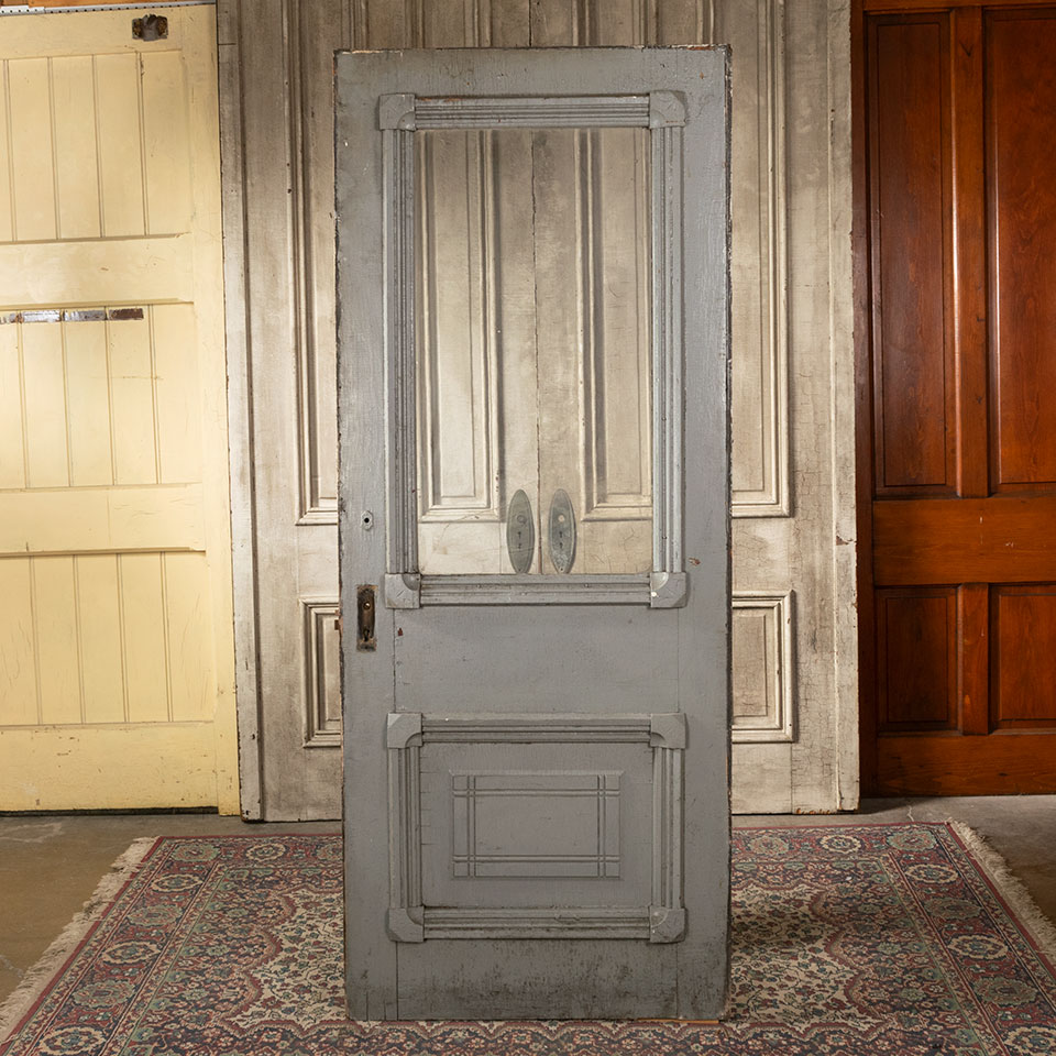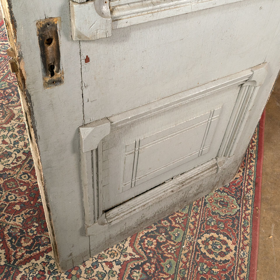 Antique architectural salvage Victorian paneled wood front entry door with half lite glass window and decorative trim measuring approximately 32 1/8" wide x 79 3/4" tall x 1 3/8" thick. Note the glass is cracked. Sold AS IS. See photos to evaluate condition.