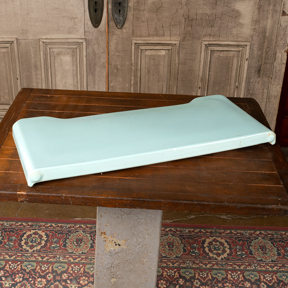 Vintage antique architectural salvage blue porcelain bathroom toilet tank lid measuring approximately 22 1/2" long x 1 1/2" thick x 9 7/8" wide overall.