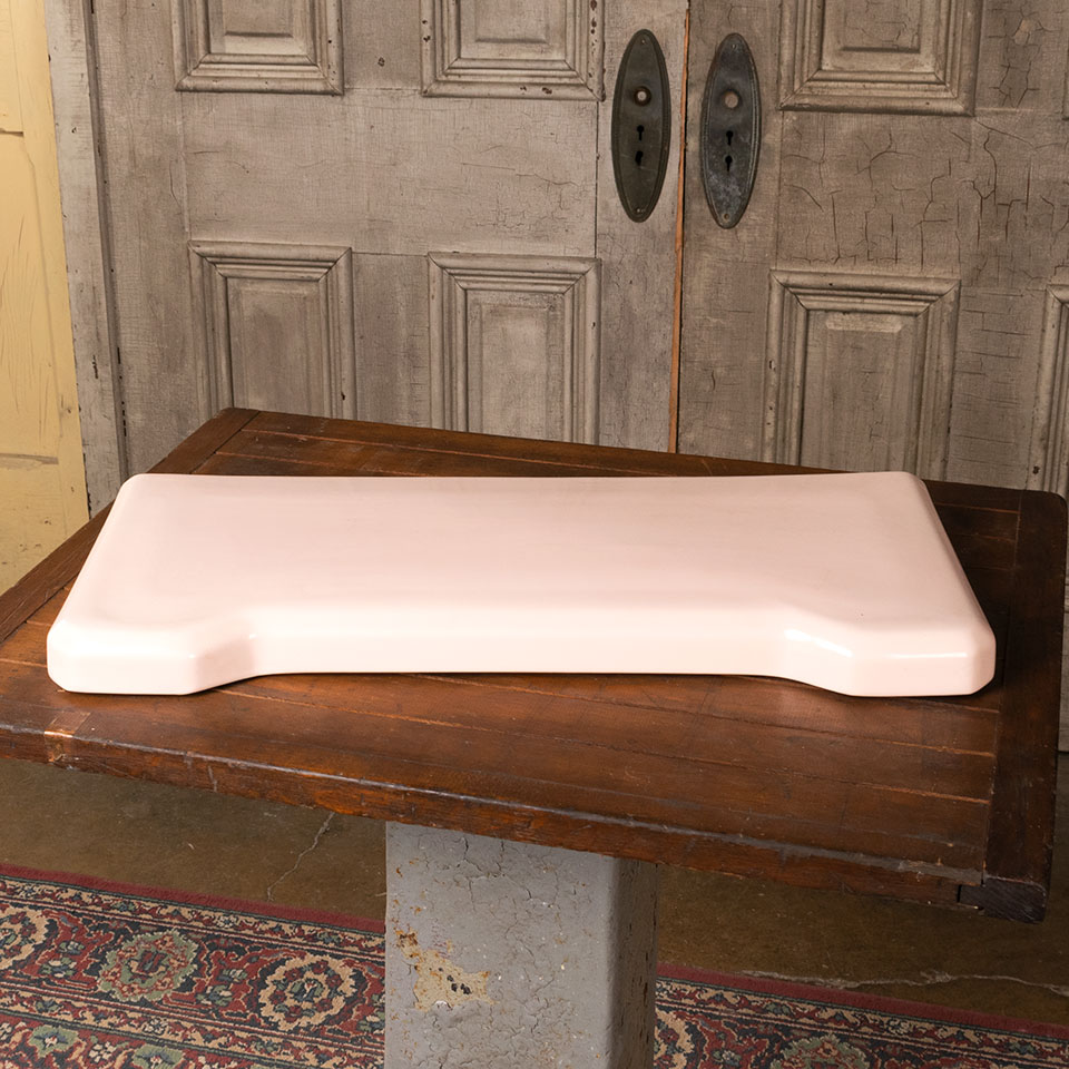 Vintage antique architectural salvage pink porcelain toilet tank lid measuring approximately 22 1/2" long x 1 1/2" thick x 9 7/8" wide overall.