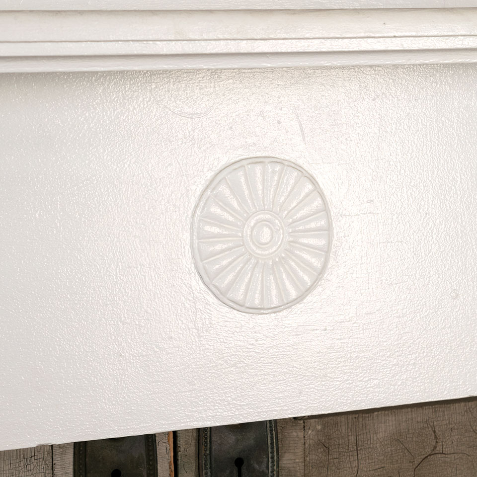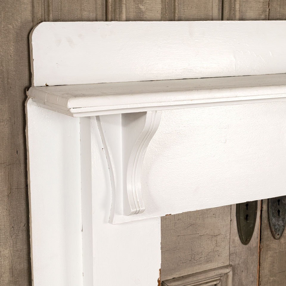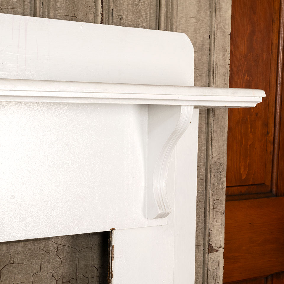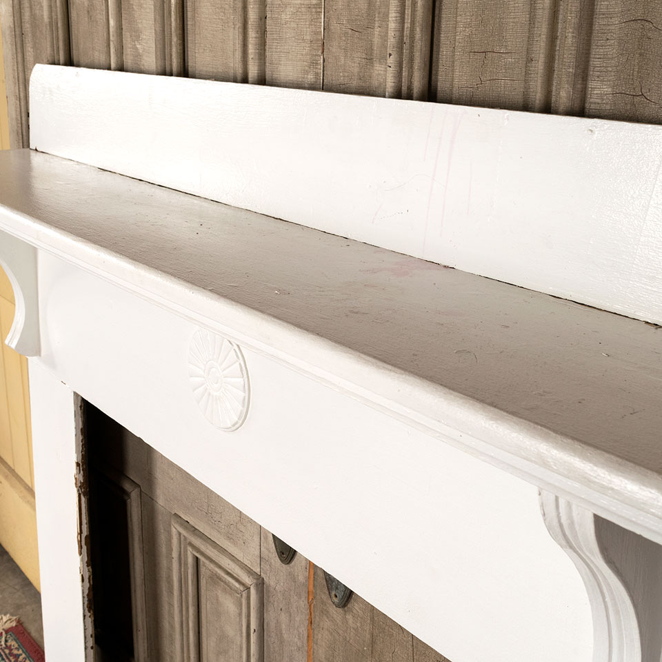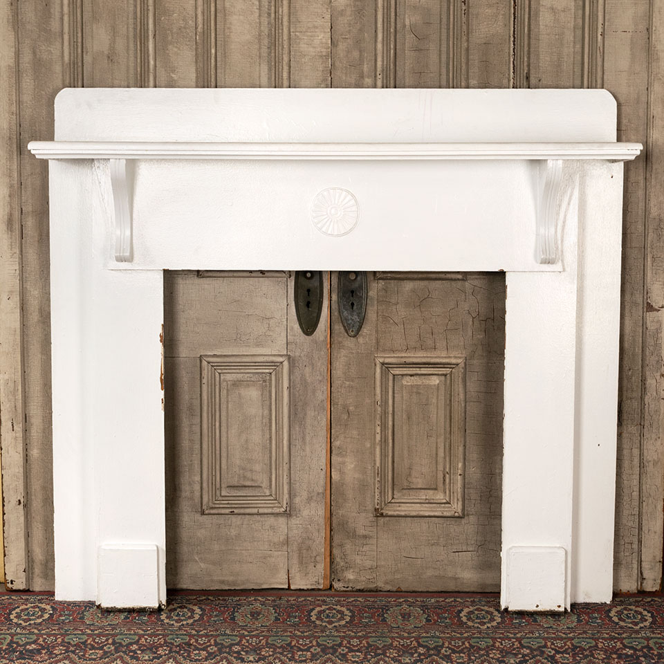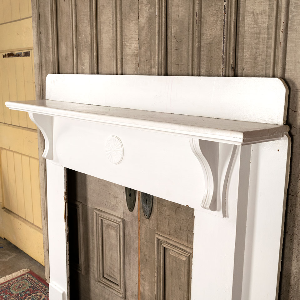 Antique architectural salvage painted wood fireplace mantel with corbel shelf brackets and center medallion applique measuring approximately 60 1/4" wide x 55" tall with a 10 1/2" projection. The firebox opening measures approximately 35 1/2" wide x 35 7/8" tall.