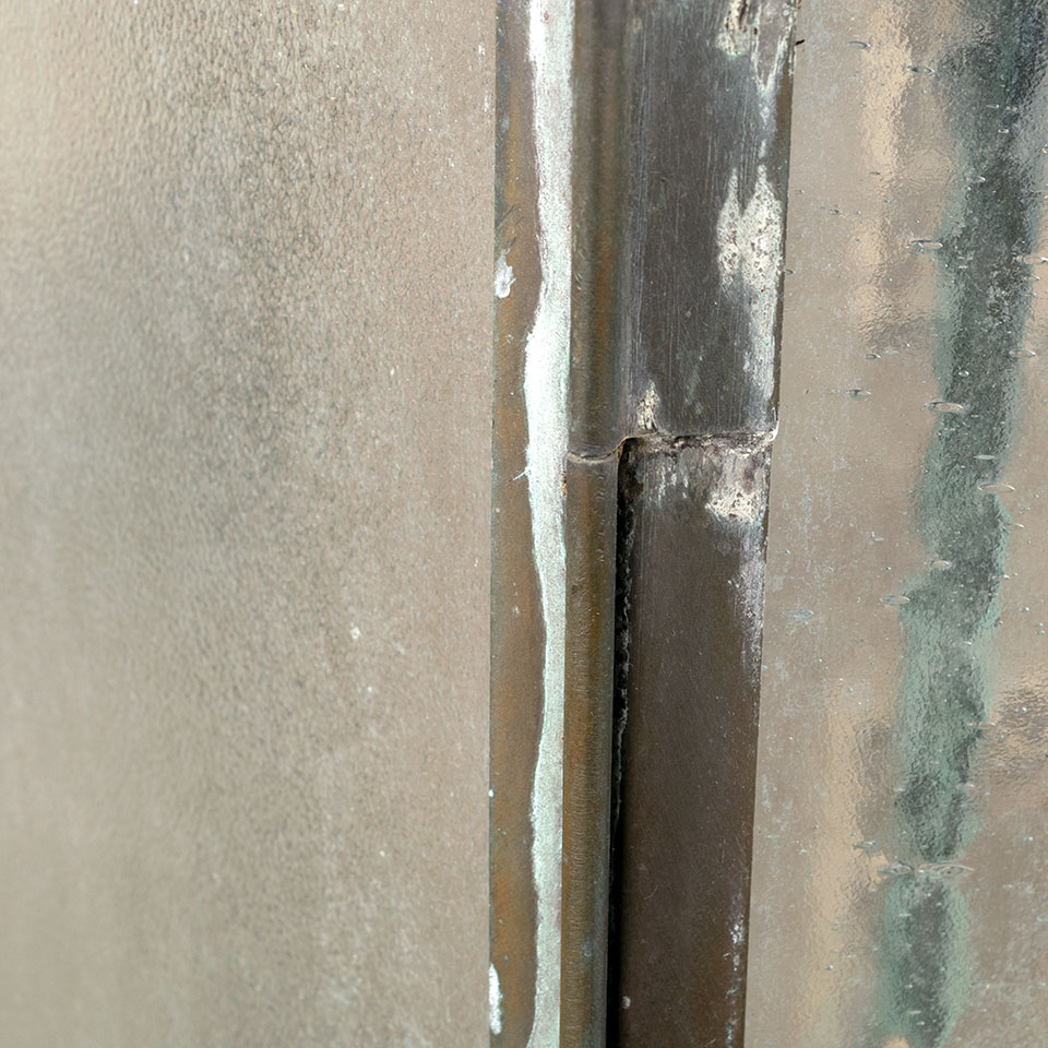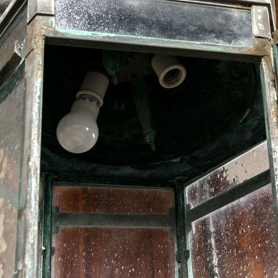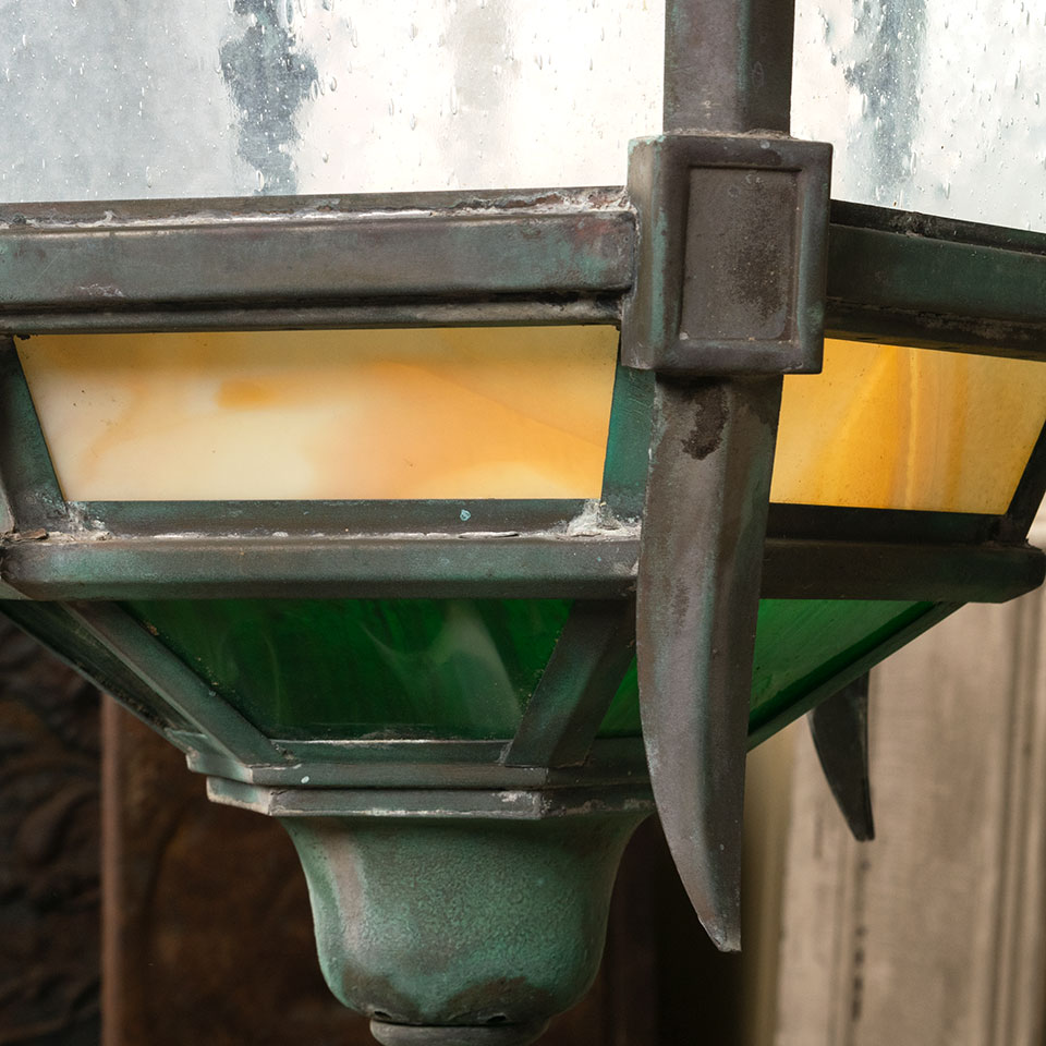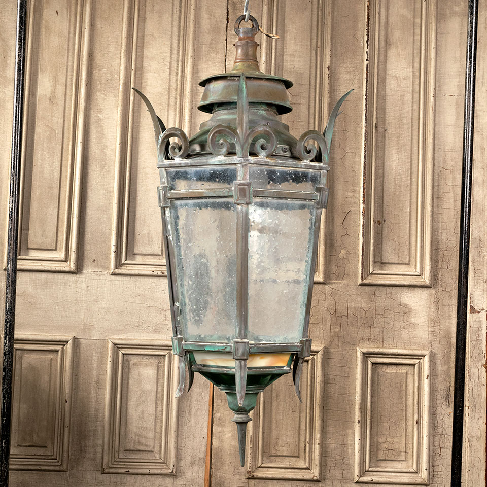 Antique architectural salvage large brass and glass Medieval Gothic Revival style fleur de lis exterior pendant lantern chandelier light fixture measuring approx. 24" in diameter x 48" tall (fixture only). See photos to evaluate condition. A licensed electrician should inspect the fixture and wiring prior to installation.