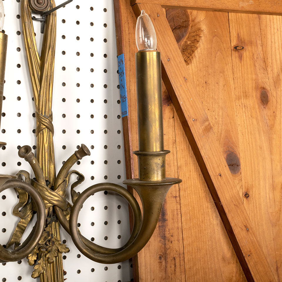 Architectural salvage antique brass interior sconces each measuring approx. 13 3/4" wide x 26" tall x 6" front to back. See photos to evaluate condition. Salvaged lighting should be tested by an electrician prior to installation. Priced at $750 for the pair.