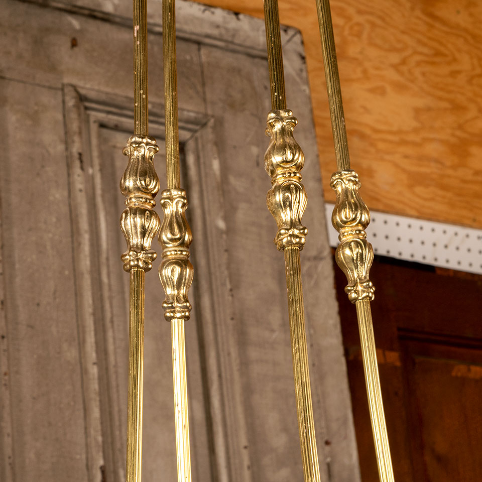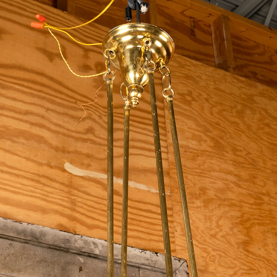 Architectural salvage reproduction 8 light brass chandelier measuring approx. 25" in diameter x 55" tall. The upright rods have some bending in them. See photos to evaluate condition.