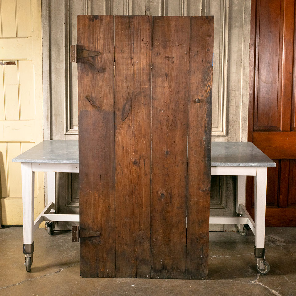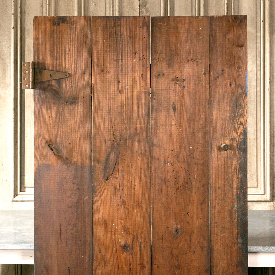 Antique architectural salvage wood slat barn door measuring approximately 35 7/8" wide x 71 5/8" tall x 7/8" thick. Includes strap hinges. See photos to evaluate condition.