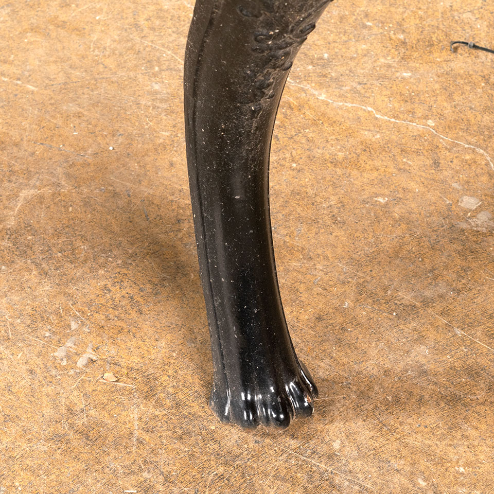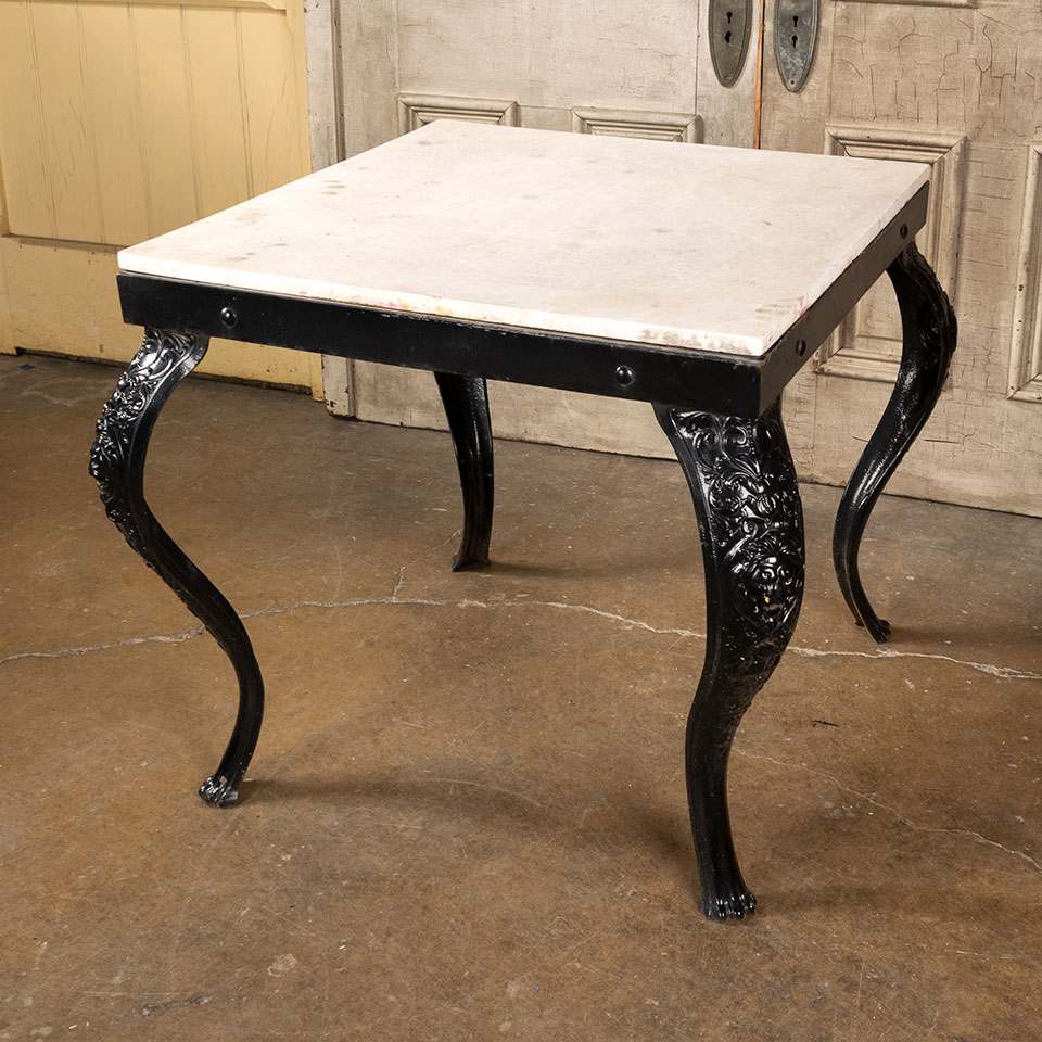 Square cast iron foyer table with decorative lion face cabriole legs and stone top measuring approximately 36" square overall x 29 1/4" tall with a 30" square top.