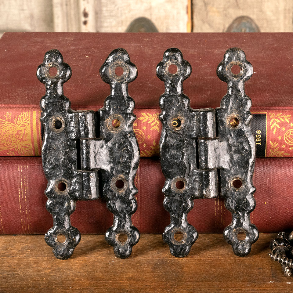 Pair of vintage antique architectural salvage iron butterfly country cabinet door hinges each measuring 2 1/8" x 4 1/2". Screws included. See photos to evaluate condition. Priced at $30 for the pair.