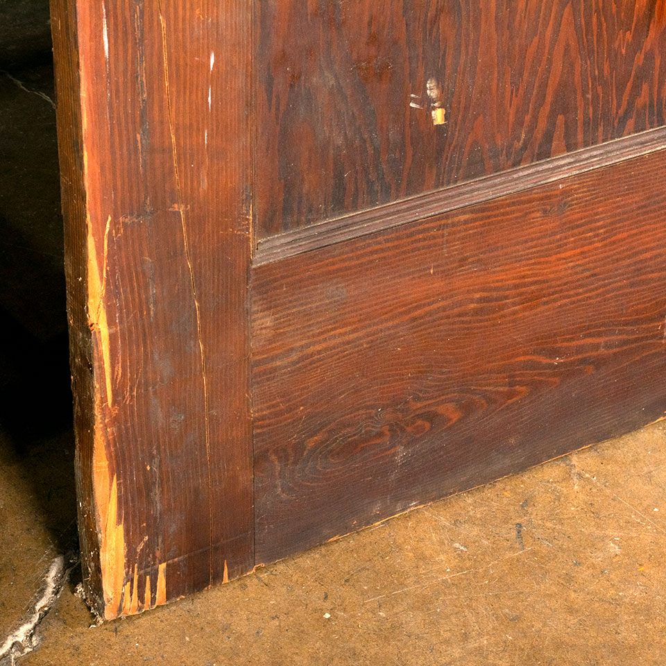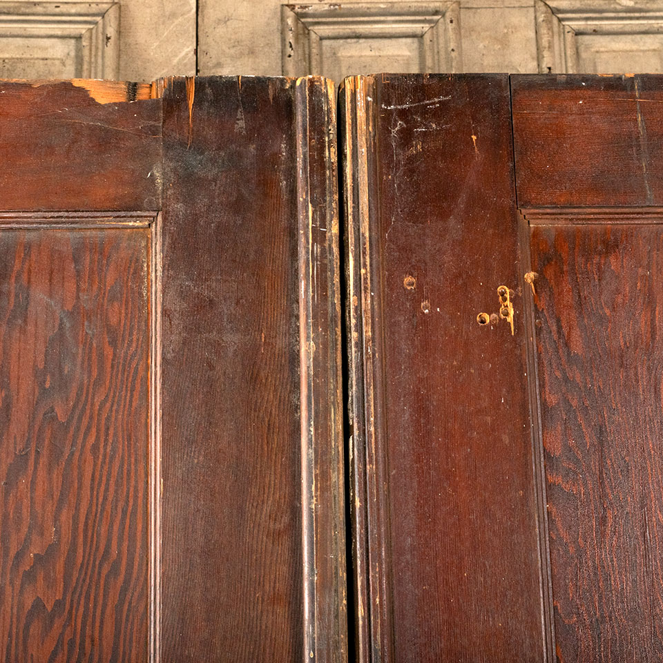 Pair of antique architectural salvage two panel pine pocket doors together measuring approximately 61 3/4" wide x 79 3/4" tall x 1 3/8" thick. There is wood missing at the top of both sides of one of the doors. See photos to evaluate condition. Priced at $350 for the pair.