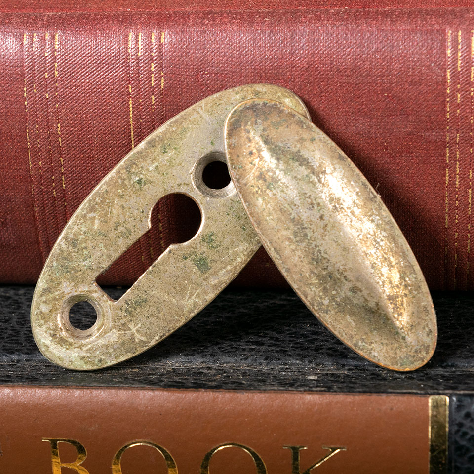 Antique architectural salvage oval nickel plated brass skeleton keyhole escutcheon cover plate door hardware with attached draft cover measuring approximately 1" wide x 2 1/8" tall x 1/4" thick. Sold individually. Priced at $20/each. Condition may vary.