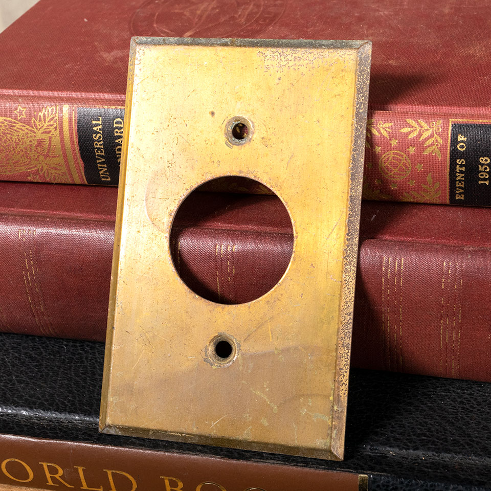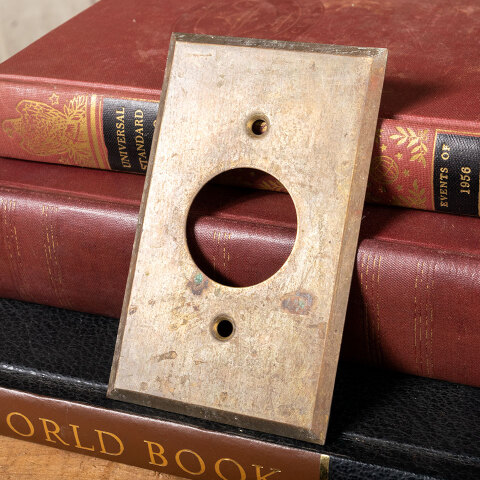 Architectural salvage antique brass single gang receptacle electrical outlet cover plate measuring 2 5/16" x 4 1/2" overall with 1 3/8" diameter opening. Color and condition vary, see photos to evaluate. Priced at $15/ each.