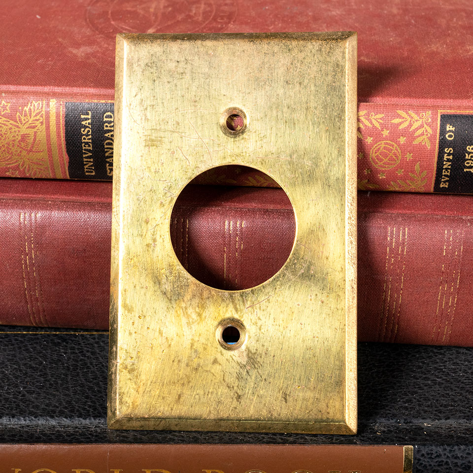 Vintage antique architectural salvage brass single gang receptacle electrical outlet cover plate.