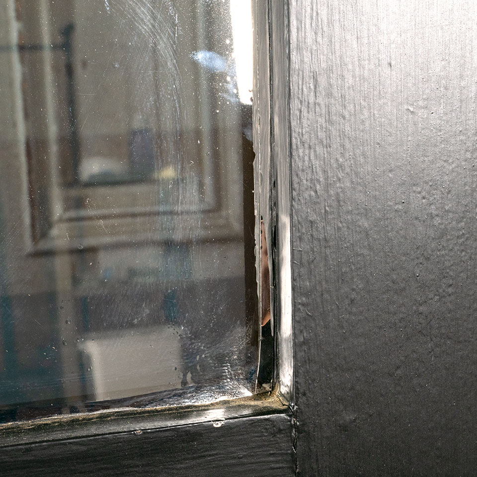 Giant antique architectural salvage paneled oak wood front, side, or rear entry door with half lite window featuring modern beveled glass pane with removable tinted reflective film. Measurements: 48" wide x 82 5/8" tall x 2 1/8" thick