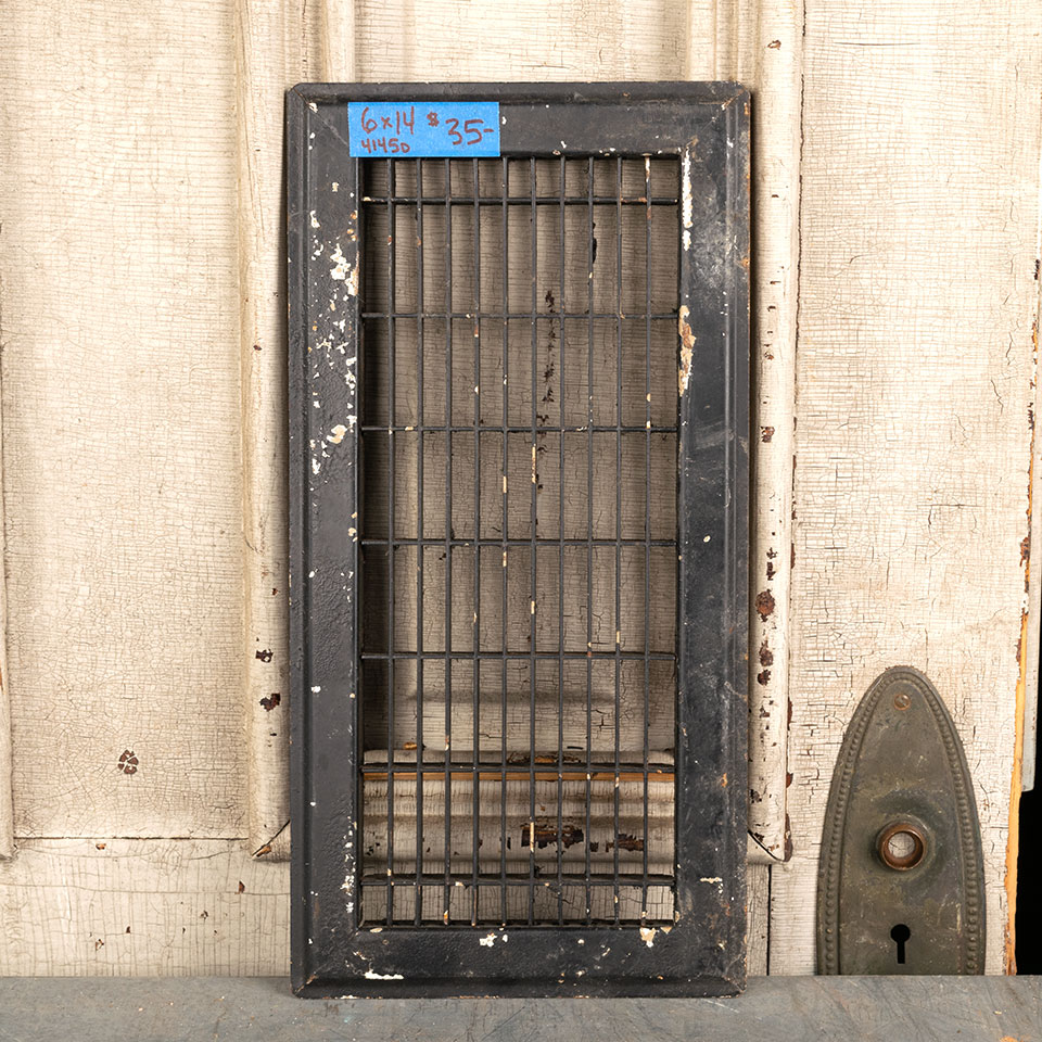 Vintage architectural salvage pressed metal floor duct cold air return grate register vent cover measuring approx. 6" x 14" (insert dimensions) and 7 7/8" x 15 7/8" (overall dimensions). Color and condition may vary, see photos to evaluate. Priced at $35/each.