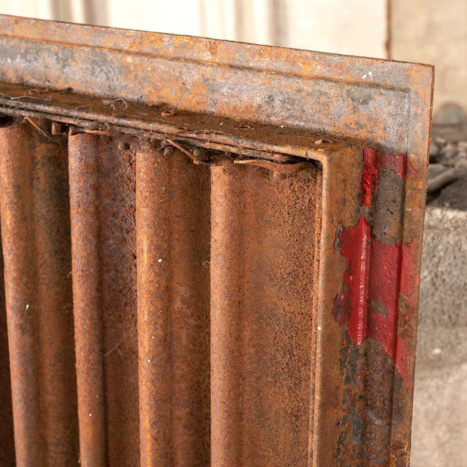 Antique architectural salvage cast iron floor heat register vent cover with louvers. Measurements: 12" x 14" insert and 13 1/2" x 15 1/2" overall