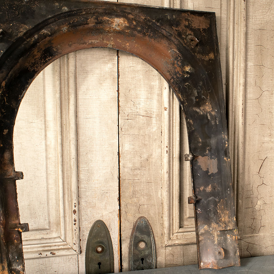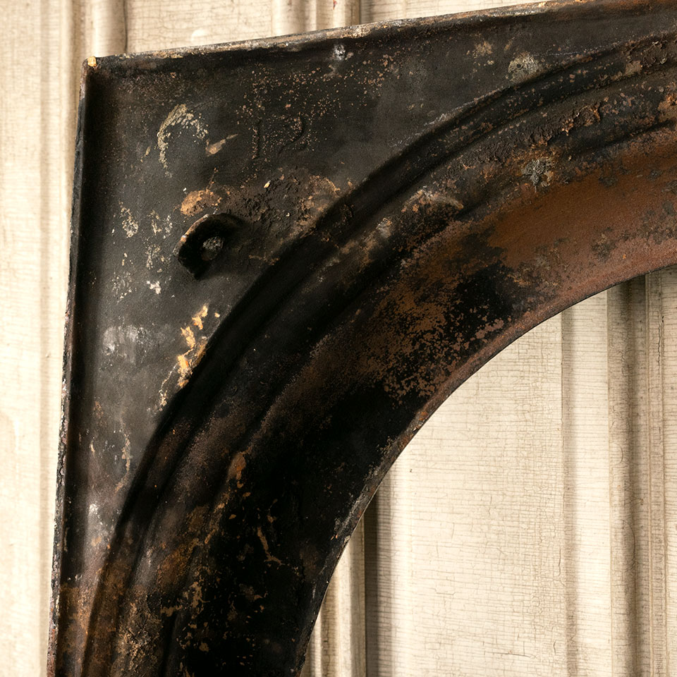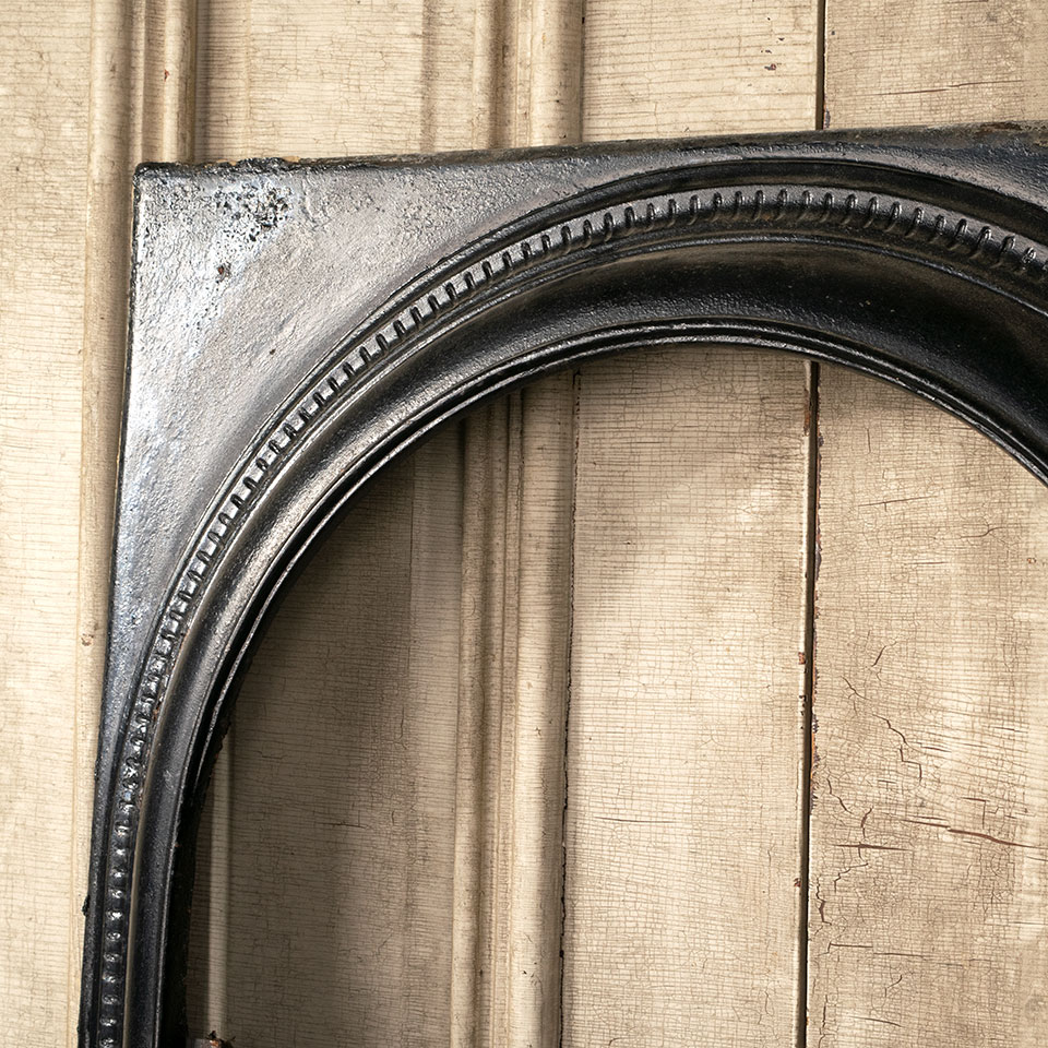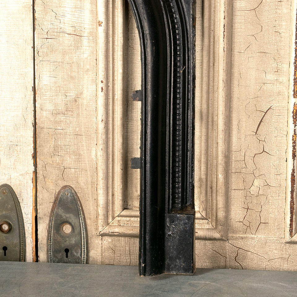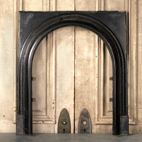 Antique architectural salvage cast iron fireplace surround with arched opening measuring approximately 25" wide x 28 3/4" tall x 2 3/4" front to back. The firebox opening measures approximately 18" wide x 24 1/2" tall.