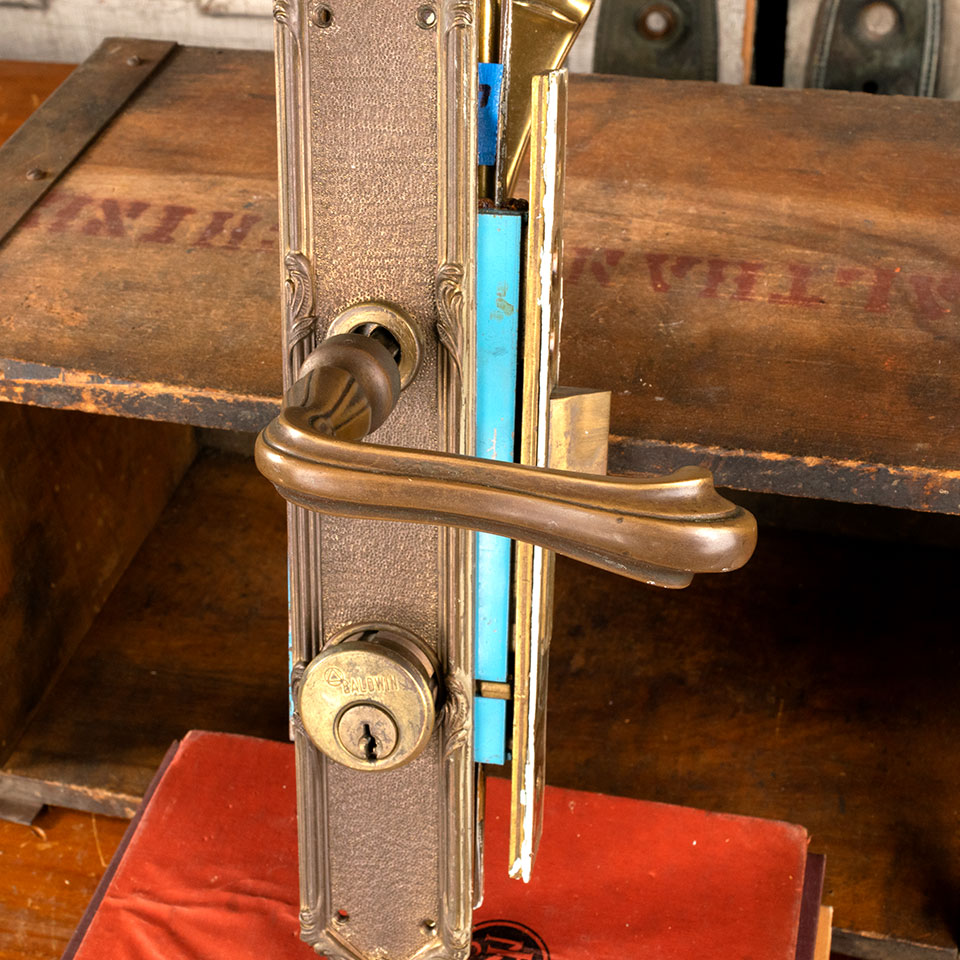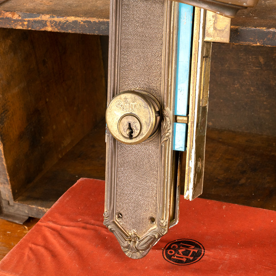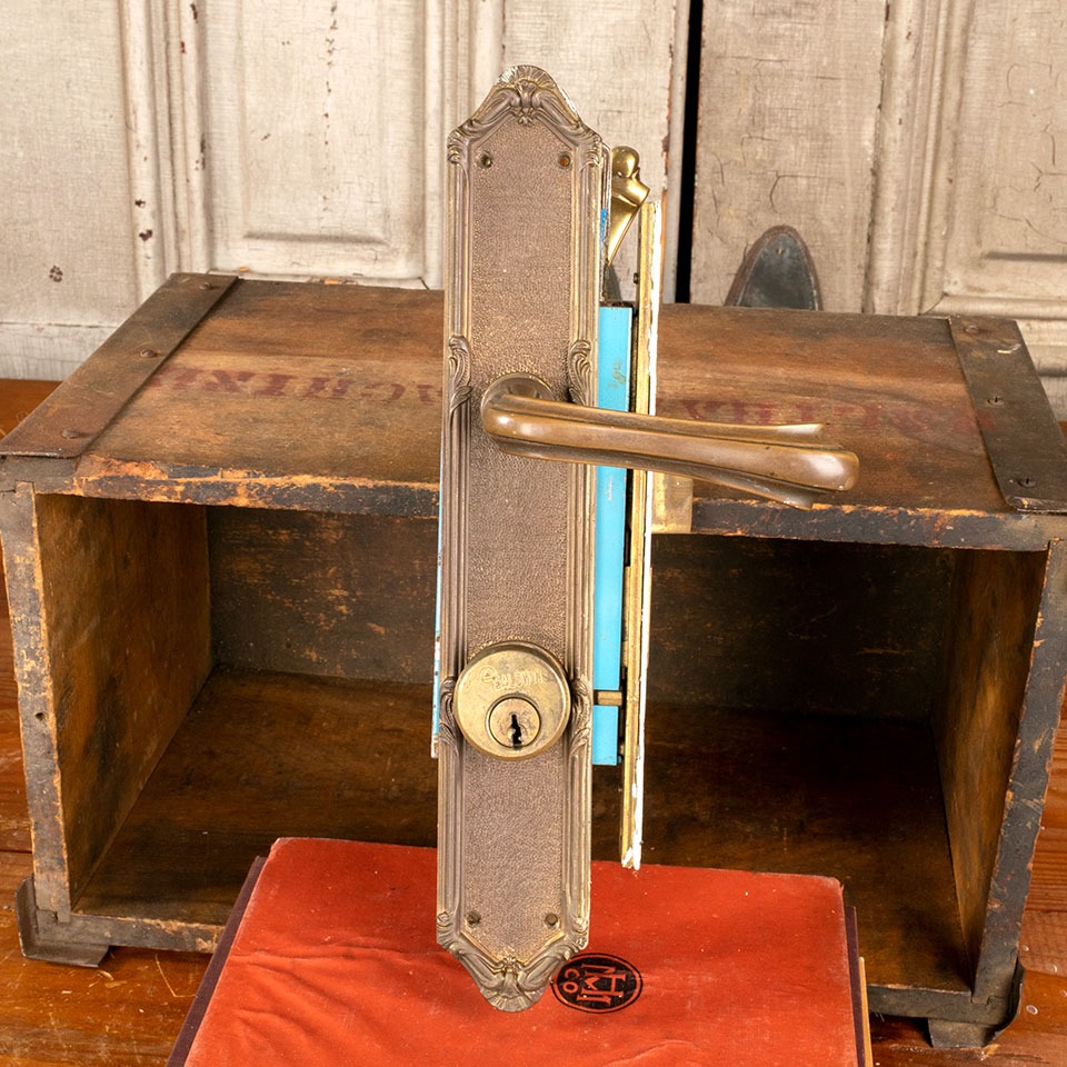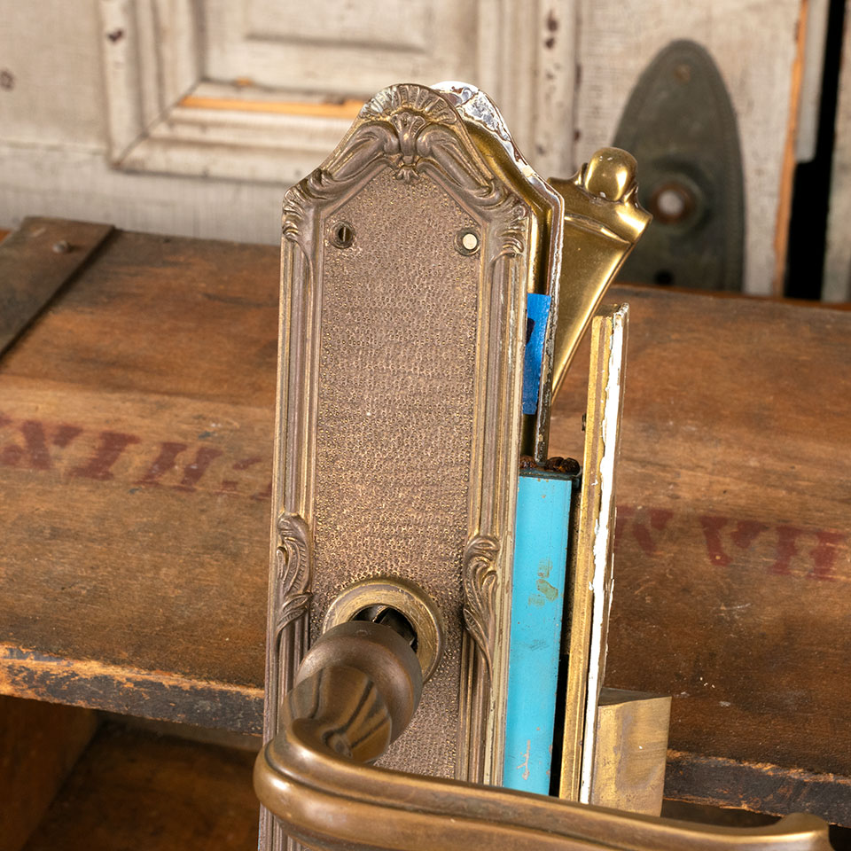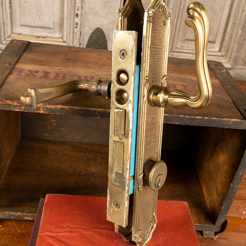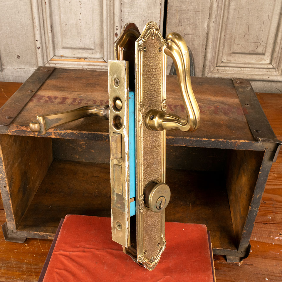 Architectural salvage reproduction brass French door hardware set. The set includes a pair of door lever handles, doorknob backplates with a deadbolt locks, mortise lock, threaded spindle, and set screws. Each lever measures approx. 4" wide x 1" tall and each backplate measures approx. 1 7/8" wide x 11 1/4" tall x 1/4" thick. The mortise lock face measures approx. 1" wide x 8" tall with a backset of 2 1/2". See photos to evaluate condition. Priced at $125 for the set.