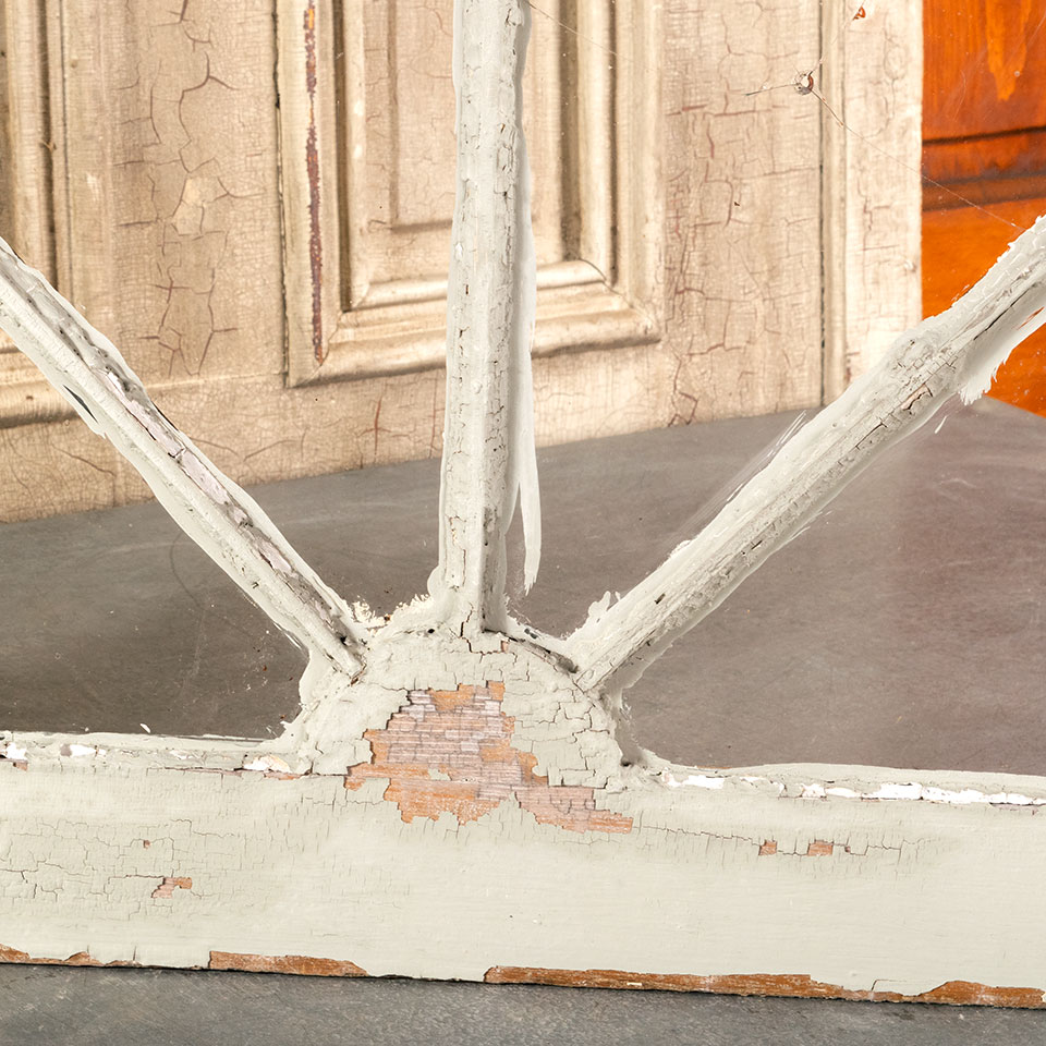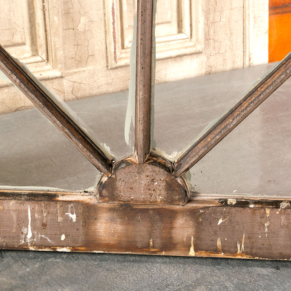 Antique architectural salvage semi-circular arched divided lite wood and glass window sash measuring approximately 34 1/4" wide x 20" tall x 1 5/16" thick. One of the panes of glass is cracked. See photos to evaluate condition.