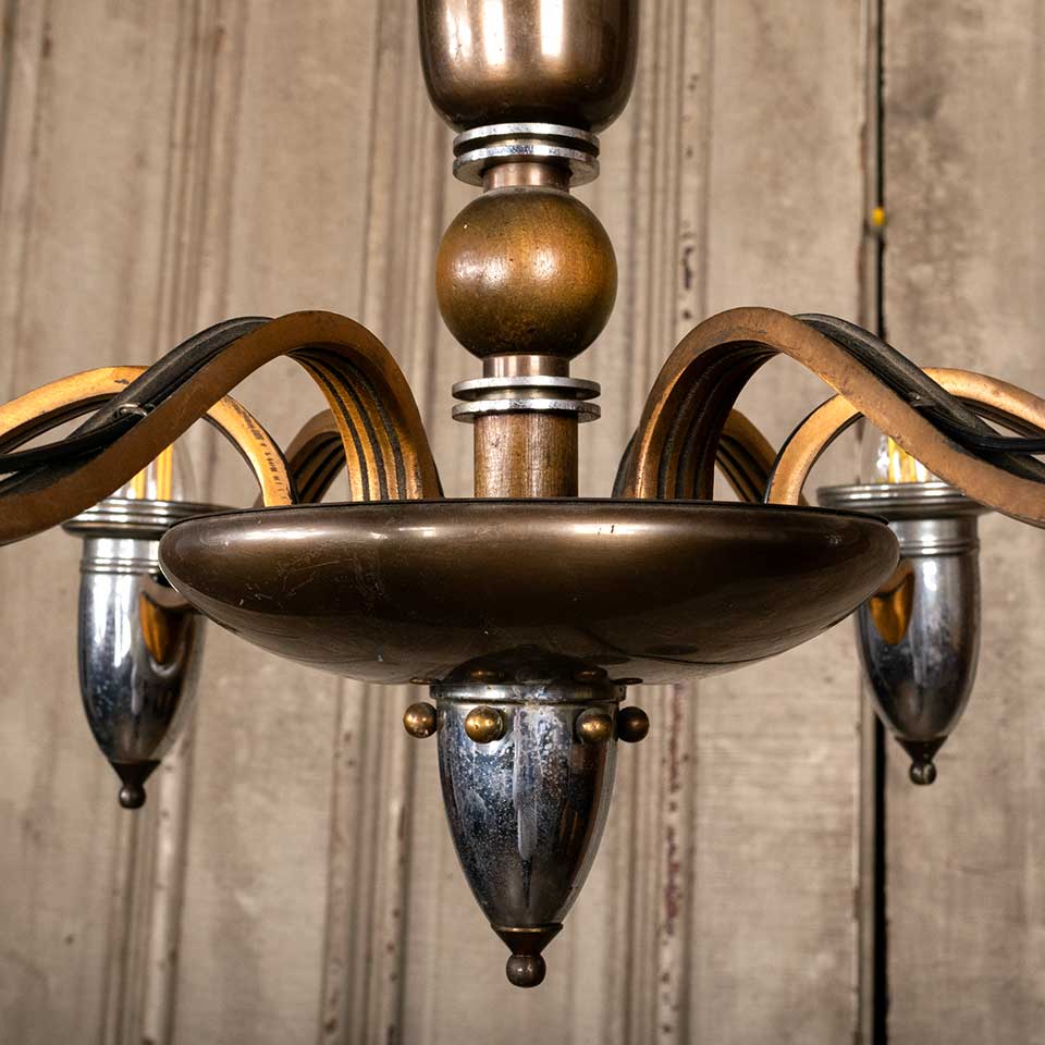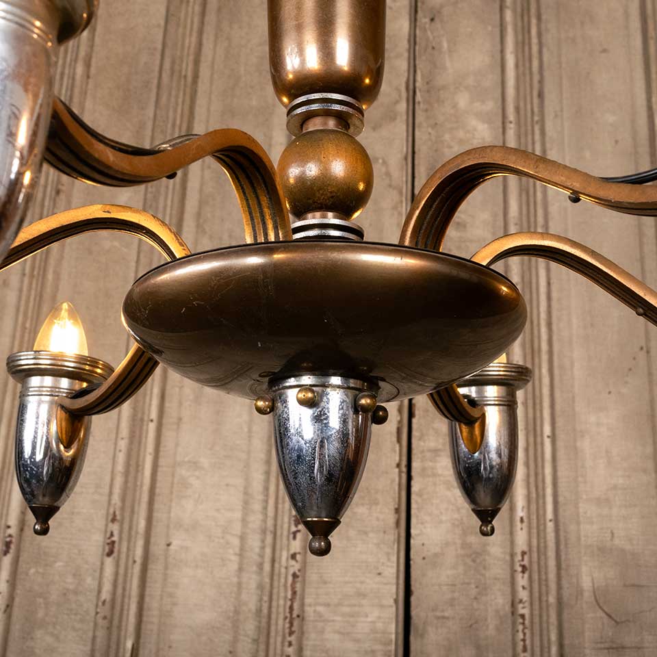 Architectural salvage vintage six light chandelier measuring approx. 23 3/4" diameter x 25" tall. This chandelier may have originally had glass shades. See photos to evaluate condition. Salvaged lighting should be inspected by a licensed electrician prior to installation.
