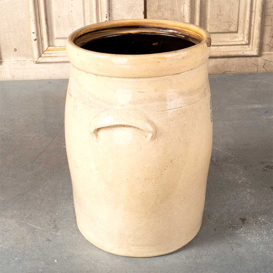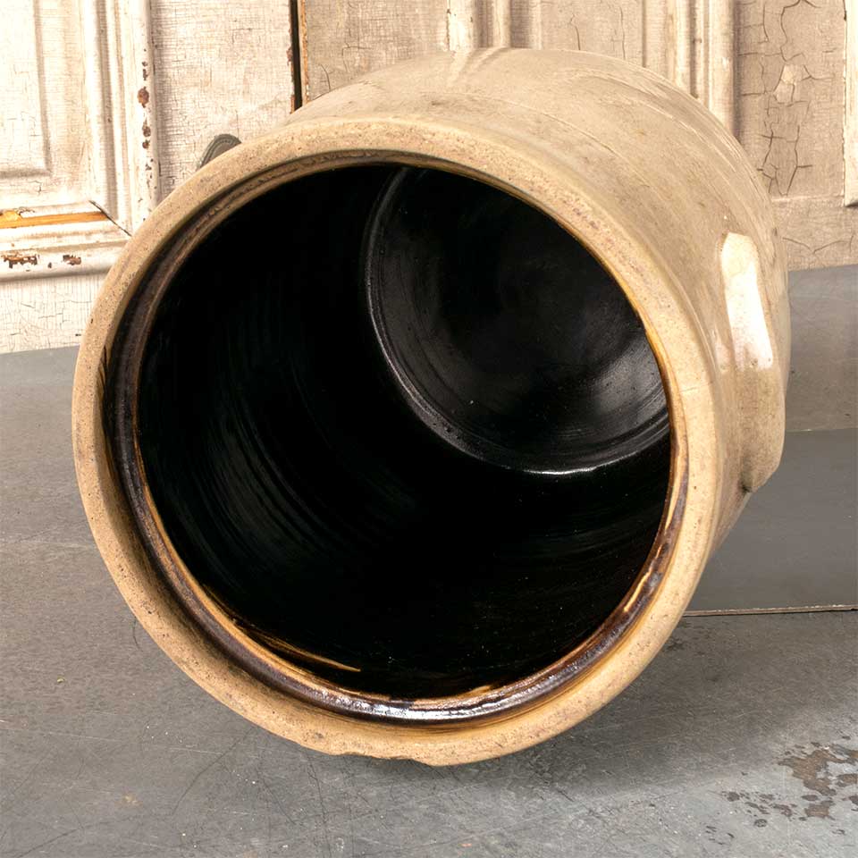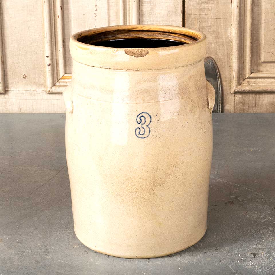 Antique 3 gallon stoneware crock with handles measuring approximately 9" in diameter x 13 1/2" tall. There is no lid with this crock and there is a chip on the outside rim. See photos to evaluate condition.