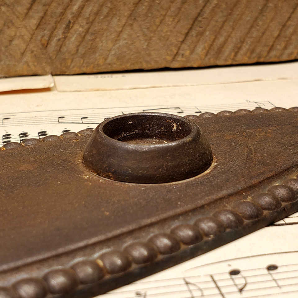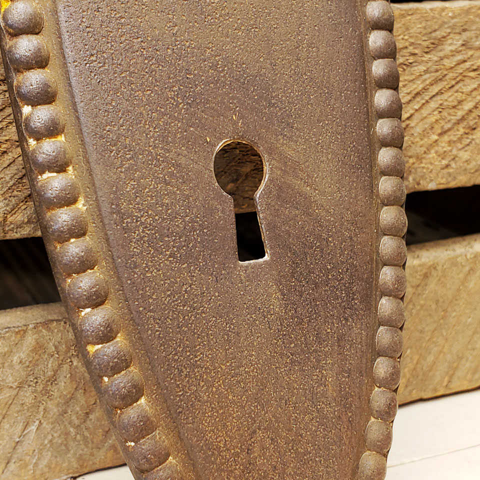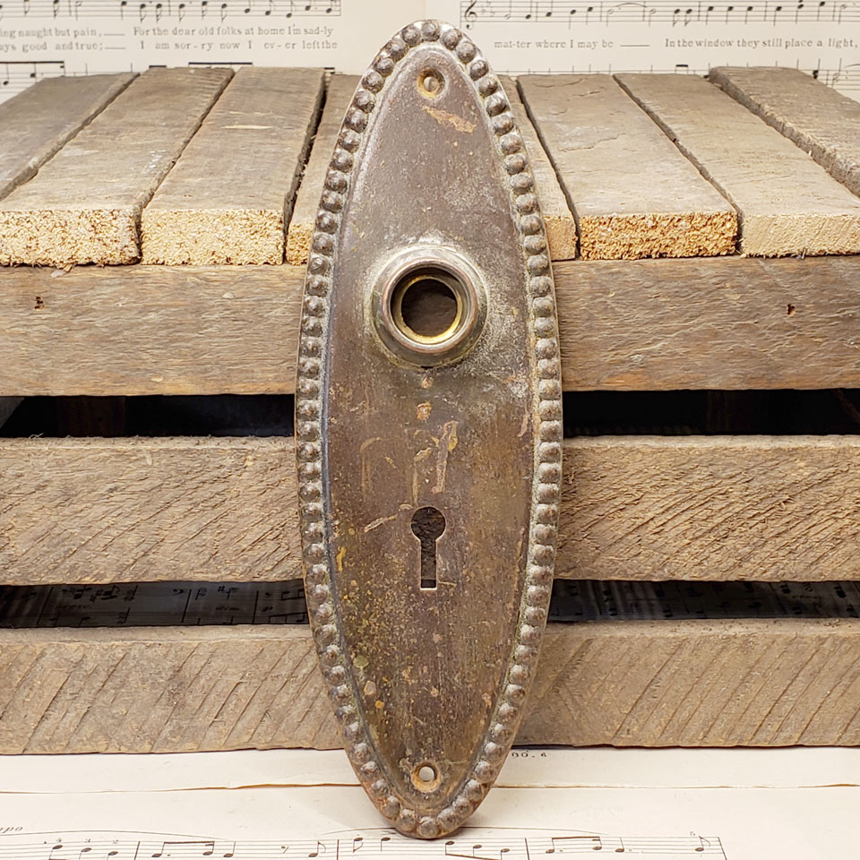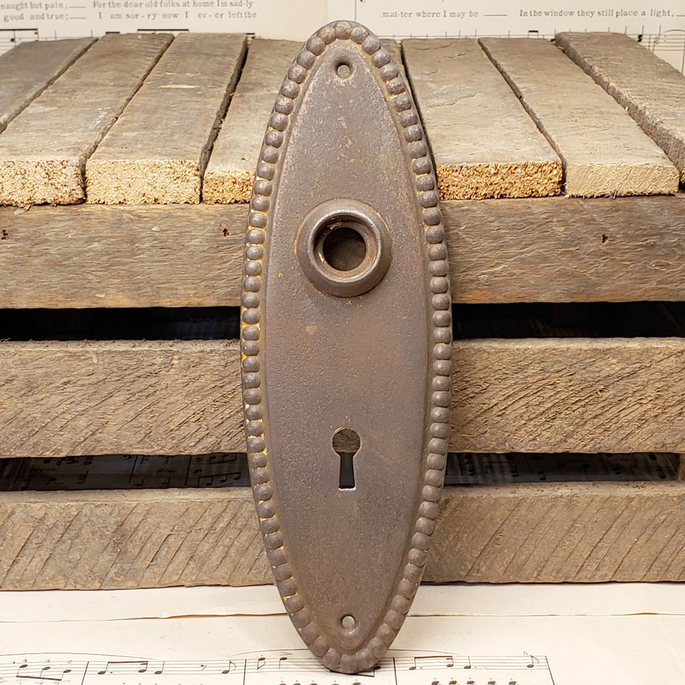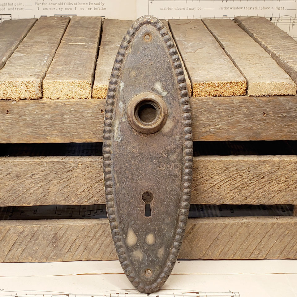 Antique architectural salvage wrought steel beaded oval doorknob backplate with skeleton keyhole measuring 2 1/2" x 7 1/2" with a 5/8" diameter collar. Sold individually. Priced at $20/each. Condition varies.