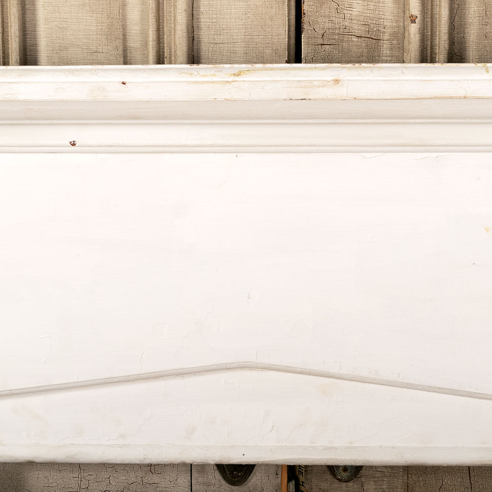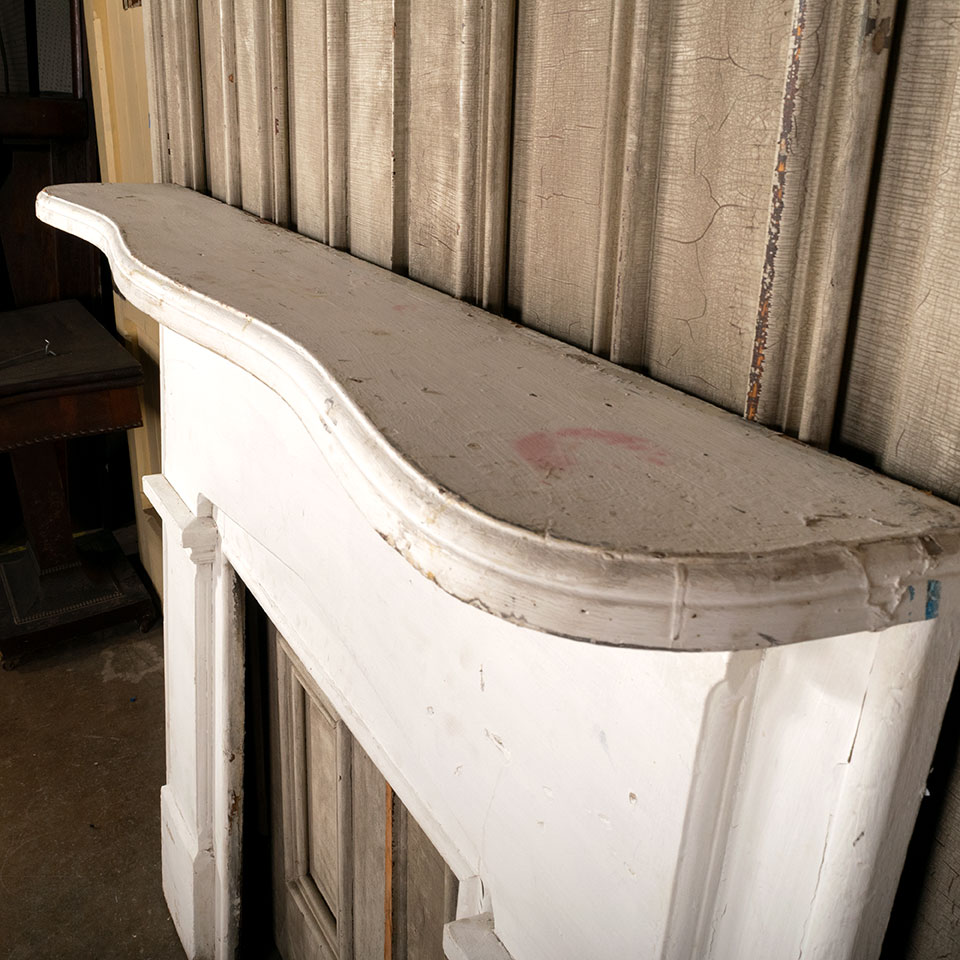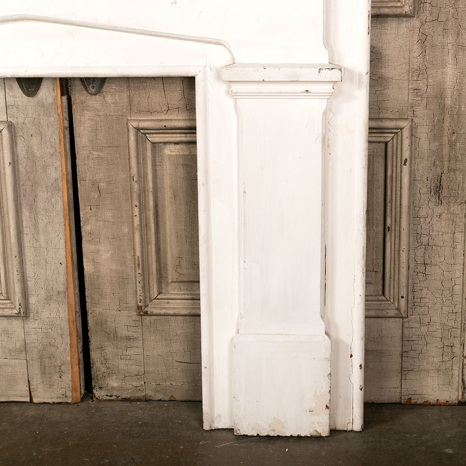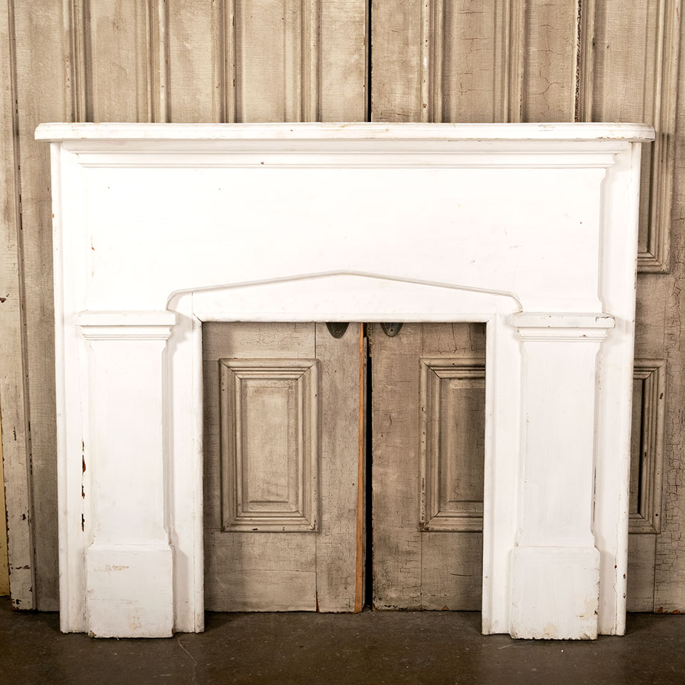 Antique architectural salvage painted wood fireplace mantel / mantle measuring approximately 56 1/4" wide x 48 3/4" tall x 8 3/4" front to back. The interior firebox opening measures approximately 27" wide x 30 5/8" tall. See photos to evaluate condition.