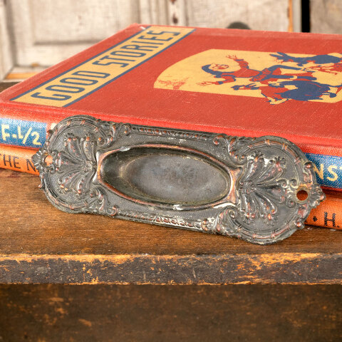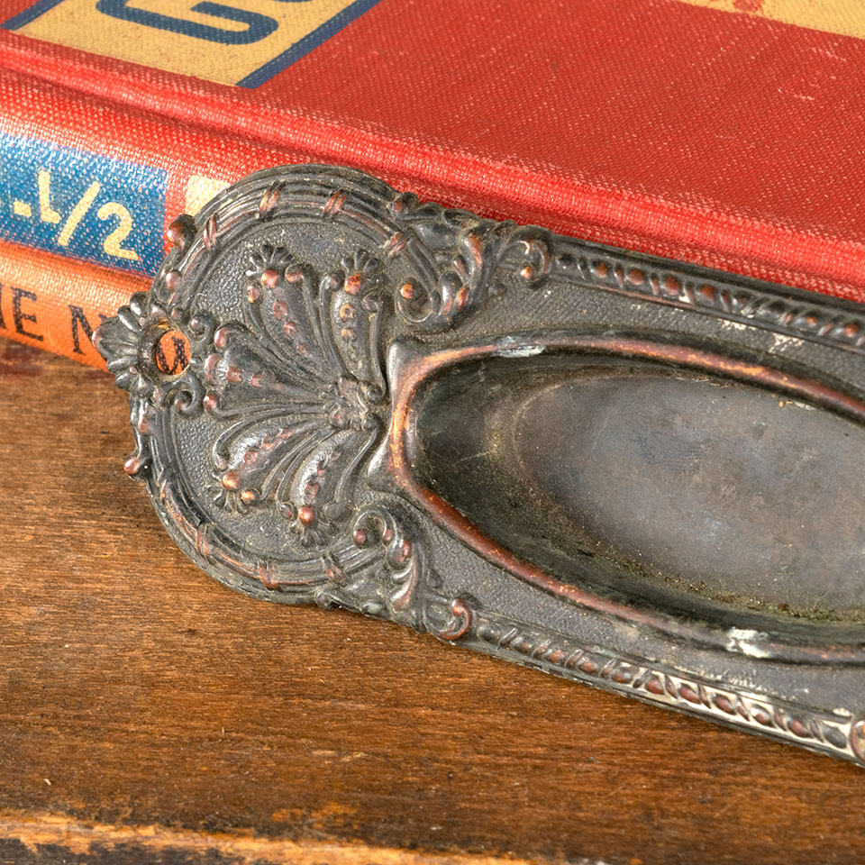 Vintage antique architectural salvage ornate bronze window sash lift hardware measuring approximately 5" wide x 1 5/8" tall x 1/2" front to back. Recessed area measures 2 1/4" wide x 1" tall.