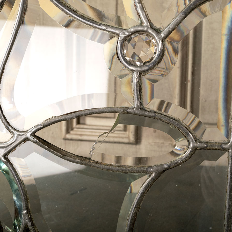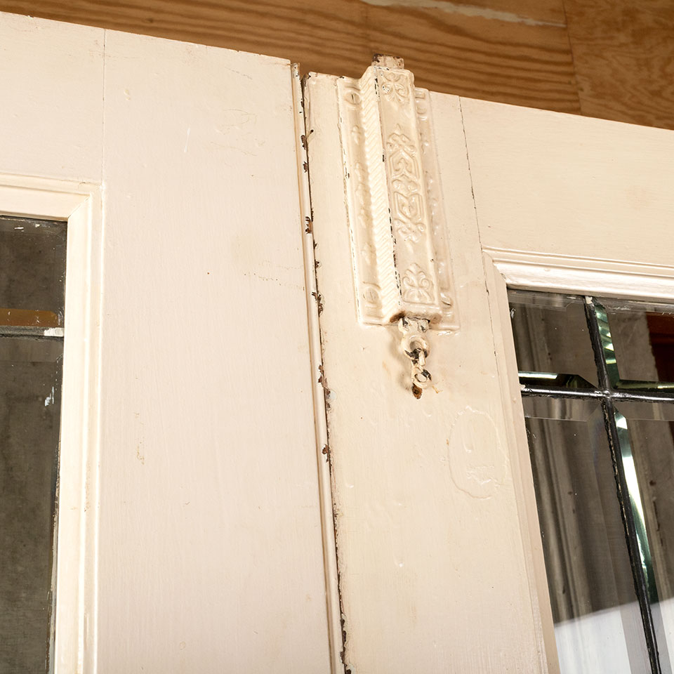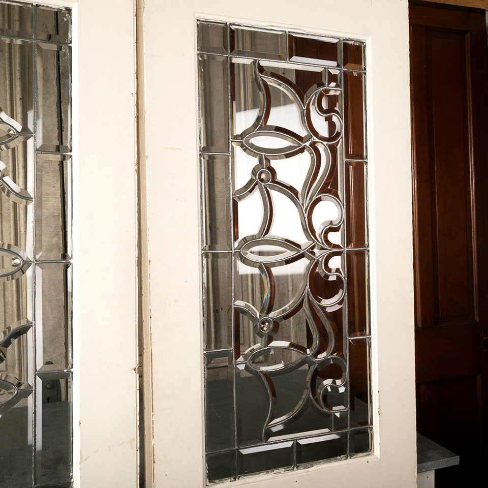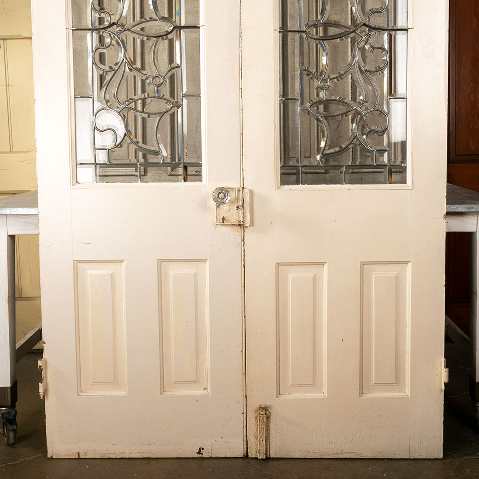 Antique architectural salvage ornate leaded glass entry doors together measuring approximately 51 7/8" wide x 79 1/2" tall x 1 3/8" thick. The hardware on the door comes AS IS. There is one broken facet. See photos to evaluate condition.
