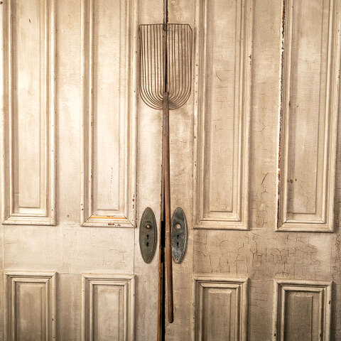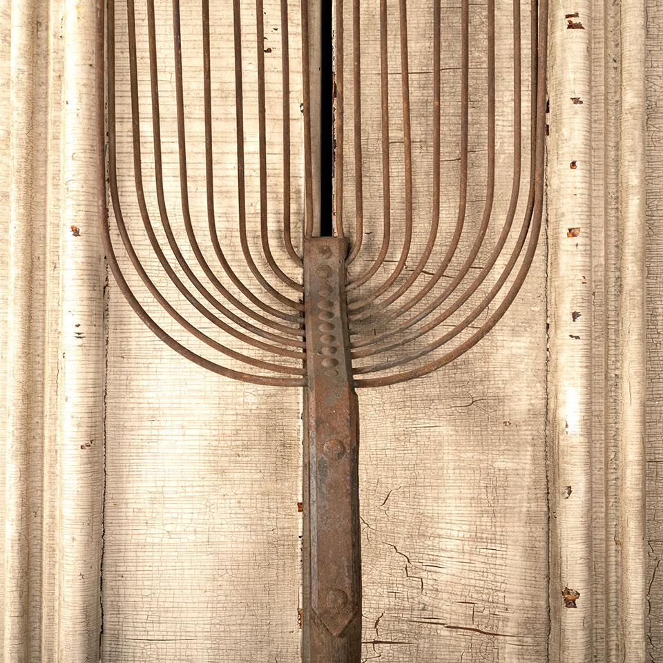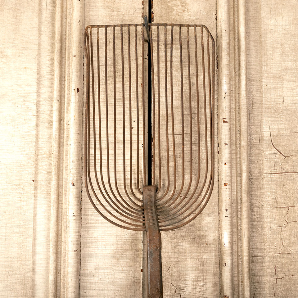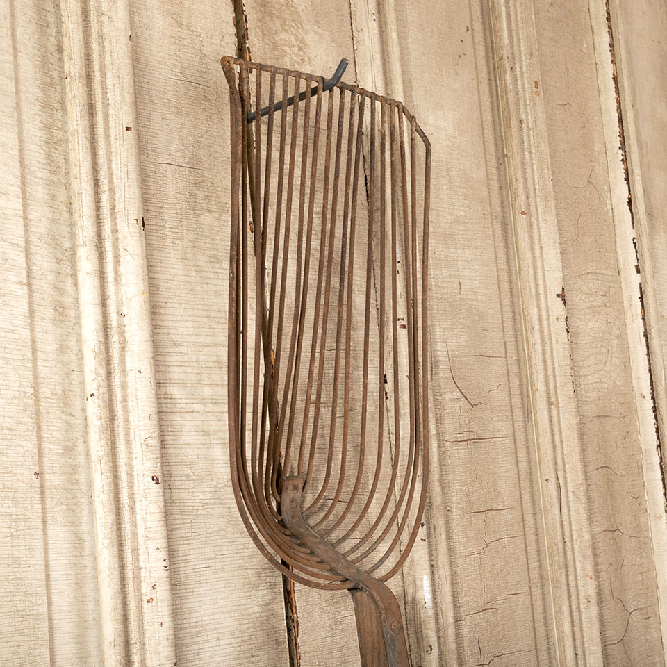 Antique primitive metal wire shovel with wood handle measuring approx. 8 3/4" wide x 50" tall x 3 3/4" front to back. See photos to evaluate condition.