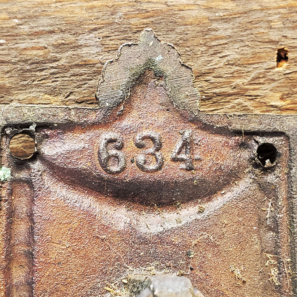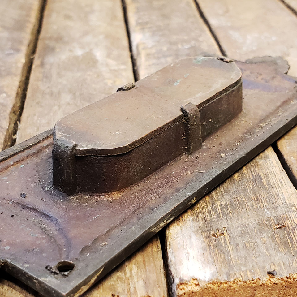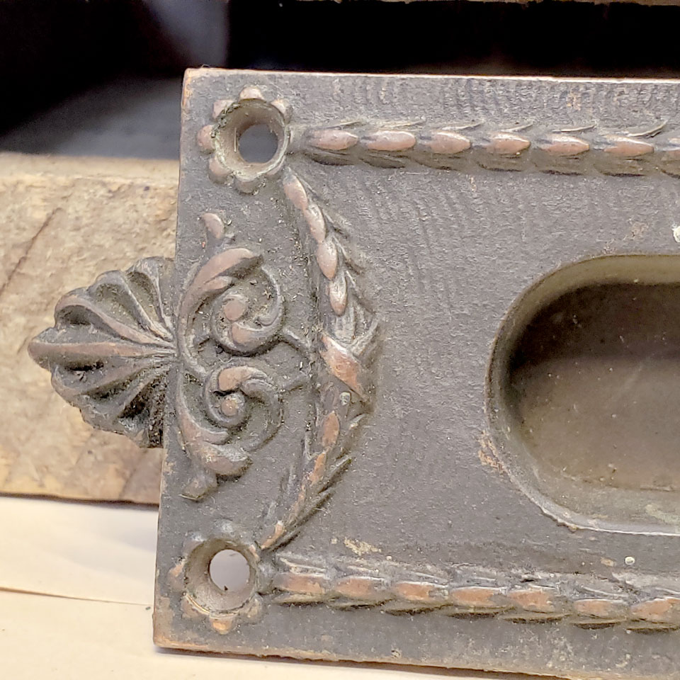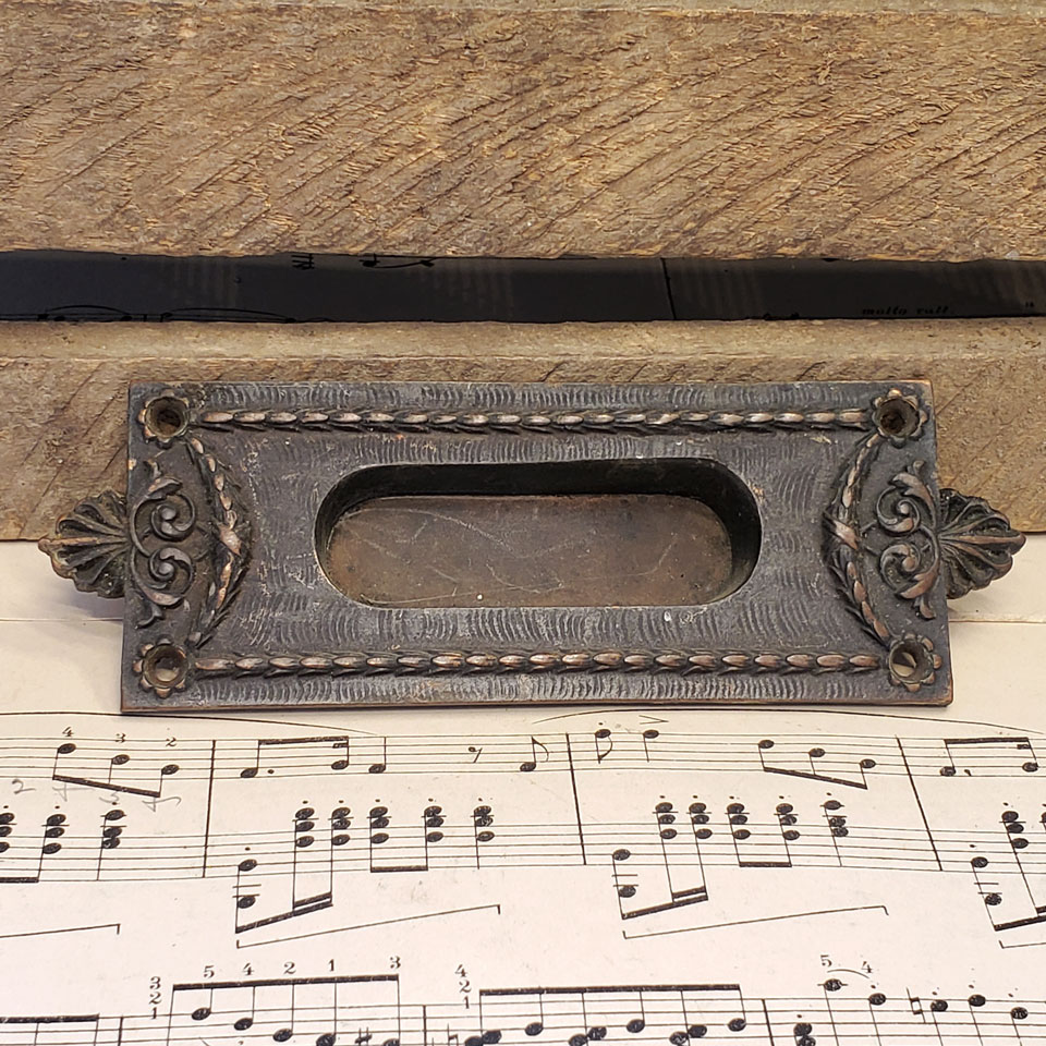Antique architectural salvage Russell & Erwin Prudhon pattern bronze window sash lift hardware circa 1897 measuring approximately 5 1/4" wide x 1 3/4" tall x 1/2" front to back. Recessed area measures 2 1/2" x 7/8". Condition may vary. Sold individually. Priced at $45/each.