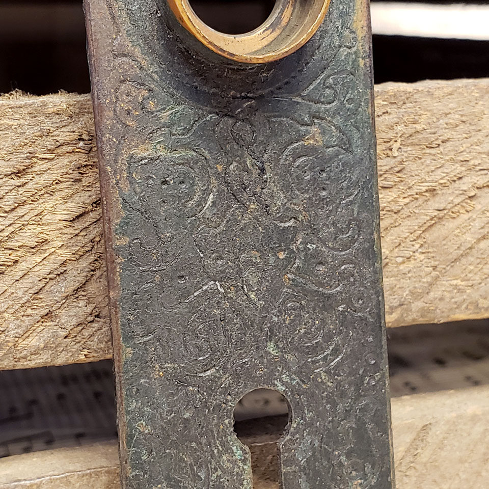 Antique architectural salvage cast iron Russell & Erwin Villa pattern circa 1890 (approx. 1 1/2" x 5 5/8" with a 3/4" diameter brass collar). The spindle & keyholes measure 2 1/2" on center. Color and condition vary - see photos to evaluate condition. Priced at $28 each.