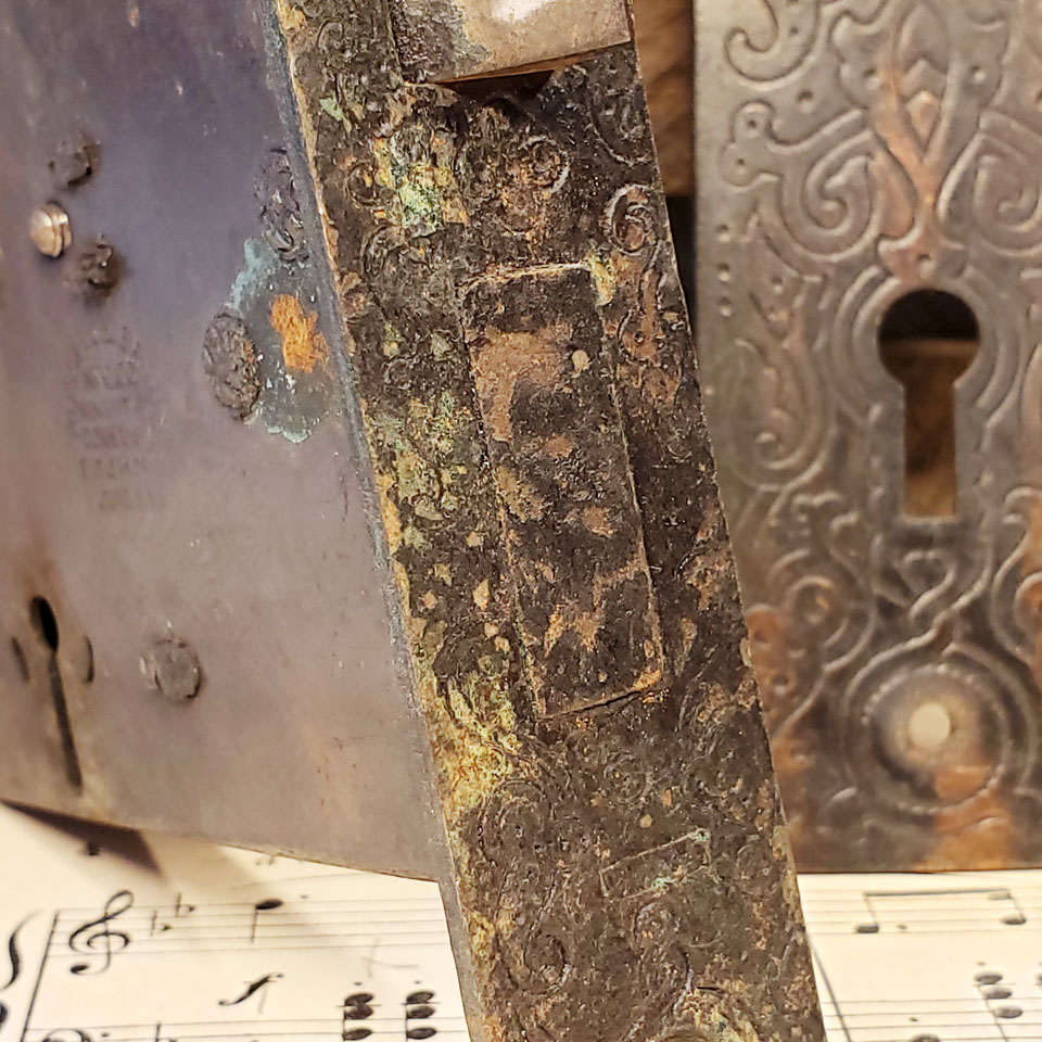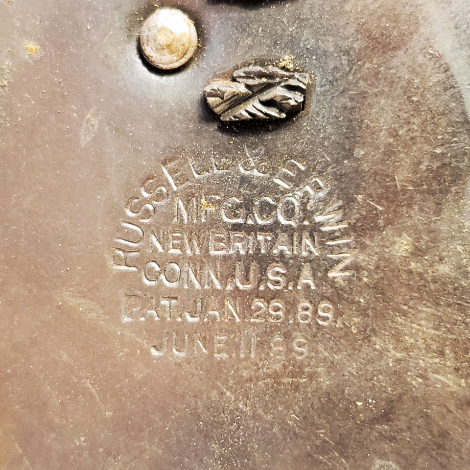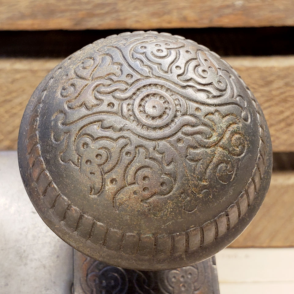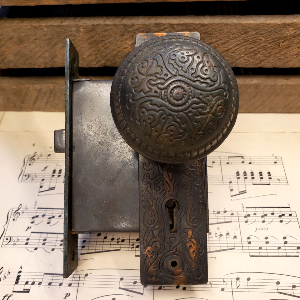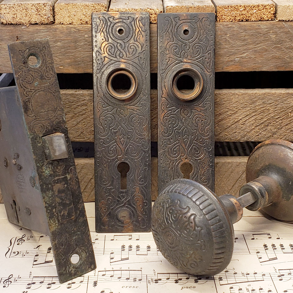 Antique architectural salvage cast metal Russell & Erwin Villa pattern (c.1890) interior door hardware set. Set includes a pair of doorknobs (approx. 2 1/4" in diameter) with tapped spindle and set screws; 2 backplates measuring approx. 1 1/2" wide x 5 5/8" tall and a reversible mortise lock measuring: face plate 1" wide x 5 1/4" tall x 1/16" thick; body measures 1/2" wide x 3 1/2" tall x 3" front to back with a 2 3/8" backset. Skeleton key included. Color and condition vary, see photos to evaluate. Priced at $225 a set.