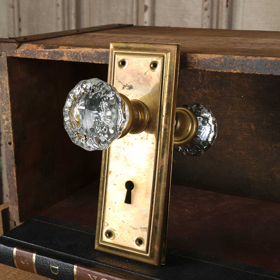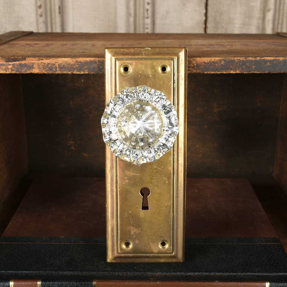 Architectural salvage antique brass and glass doorknob door hardware set including two fluted glass doorknobs (2" in diameter), two brass backplates (2 1/2" wide 6 7/8" tall x 1/4" thick), and a threaded spindle with set screws. See photos to evaluate condition. Priced at $150 for the set.