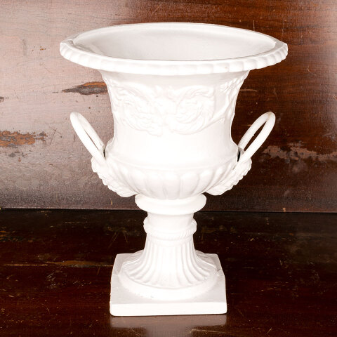 Architectural salvage small cast iron planter urn with handles measuring approx. 10" in diameter x 12" tall. See photos to evaluate condition.