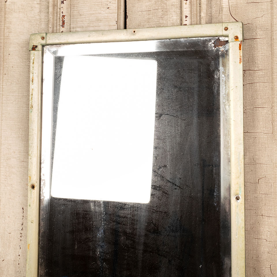 Vintage architectural salvage industrial beveled glass mirror in metal frame measuring approx. 17 1/2" x 25 1/2 x 3/4" front to back. Some of the silvering on the back is worn off. See photos to evaluate condition.