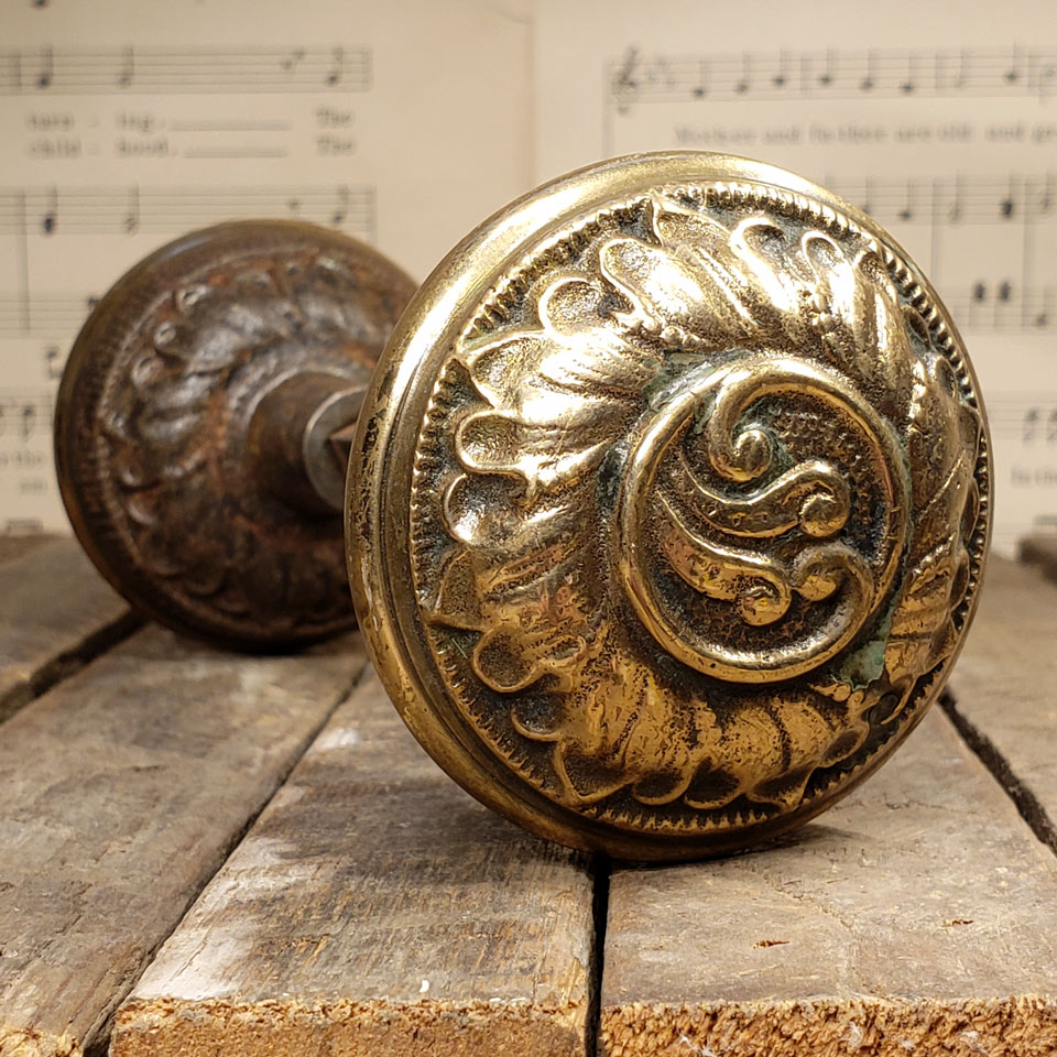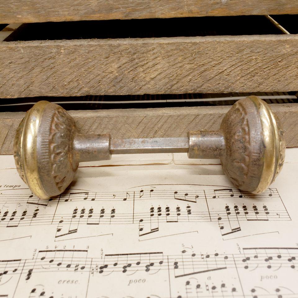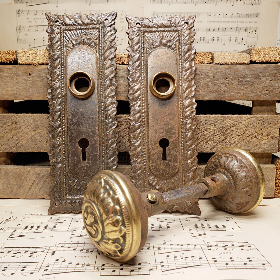 Antique architectural salvage cast iron and brass Norwich Lock Company interior door hardware set circa 1892 including a pair of 2 1/4" diameter doorknobs with tapped spindle and set screws and a pair of 2 3/8" x 7" backplates. Sold as a set. Priced at $195 for the set.