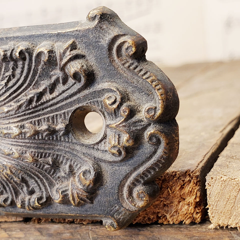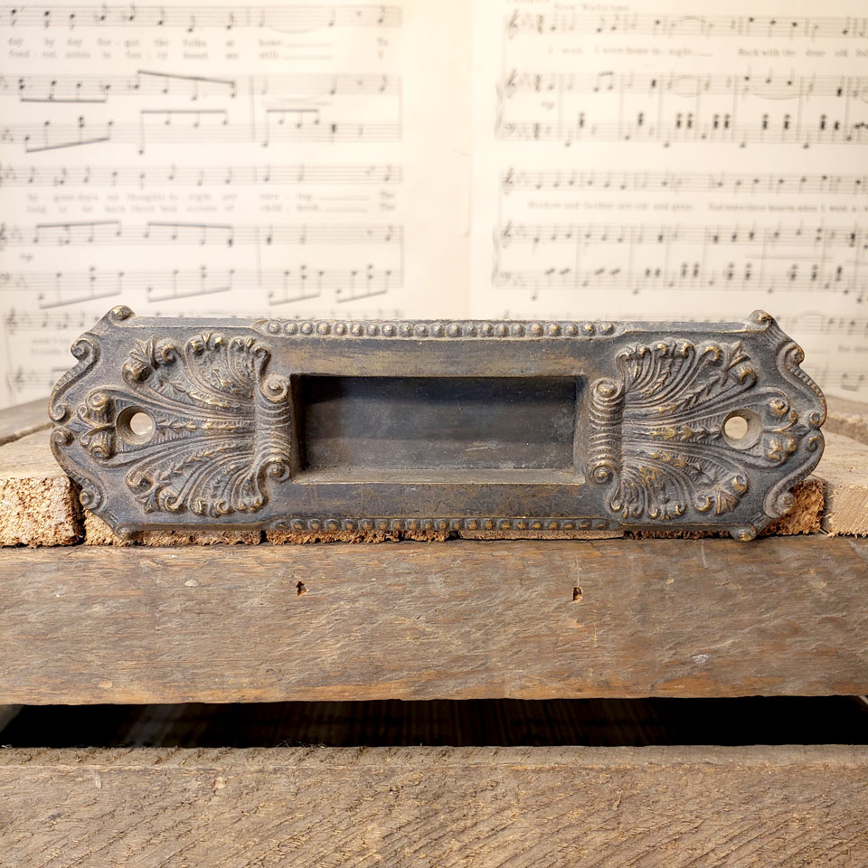Antique architectural salvage cast bronze recessed window sash lift hardware measuring approximately 5 5/8" wide x 1 3/4" tall x 5/8" front to back. Recessed area measures 2 1/4" x 7/8". Sold individually. Condition may vary. Priced at $45/each.