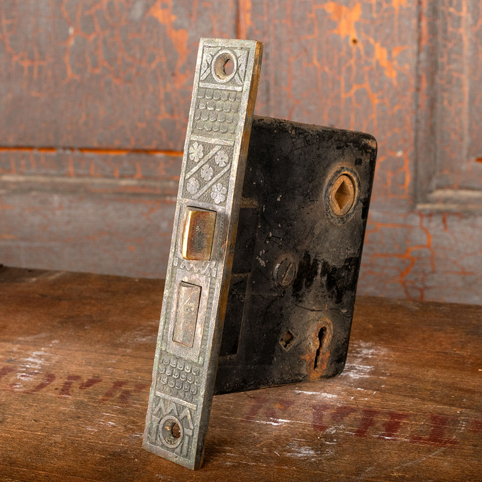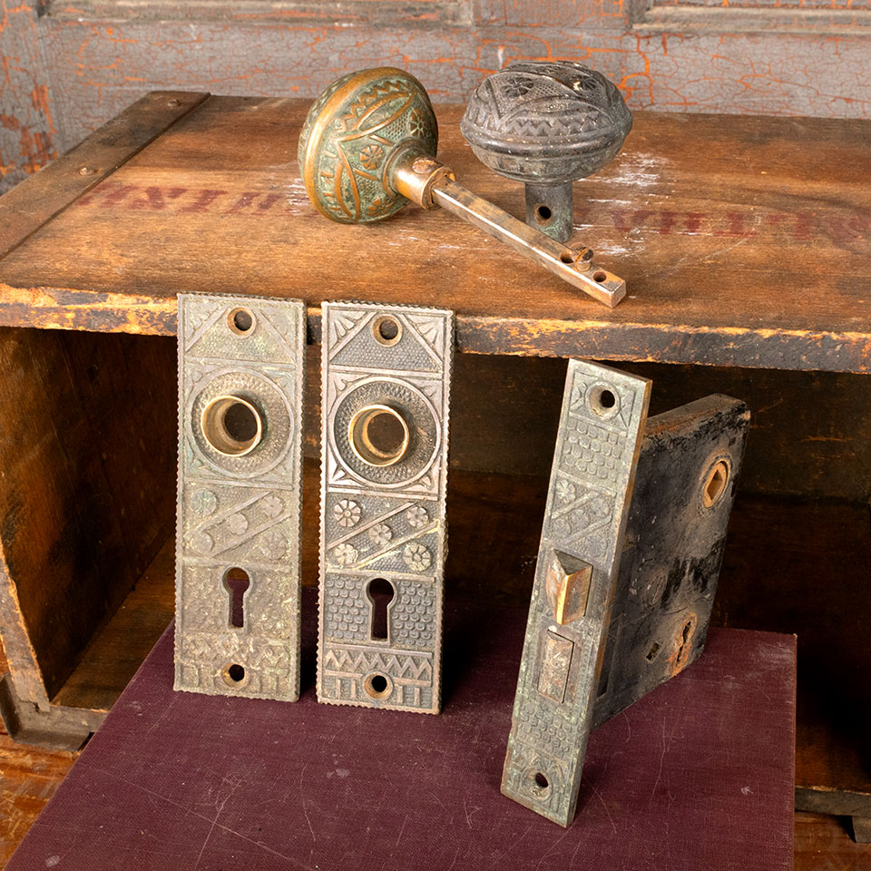 Antique architectural salvage cast bronze F. C. Linde (circa 1885) Victorian door hardware set. The set includes 2 doorknobs (2 1/4" in diameter), a tapped spindle with set screws, 2 backplates (1 5/8" wide x 5 1/8" tall), and a mortise lock (face plate 1" wide x 5 1/4" tall & body 3 1/4" front to back). See photos to evaluate condition. Sold as a set. Priced at $225 for the set.